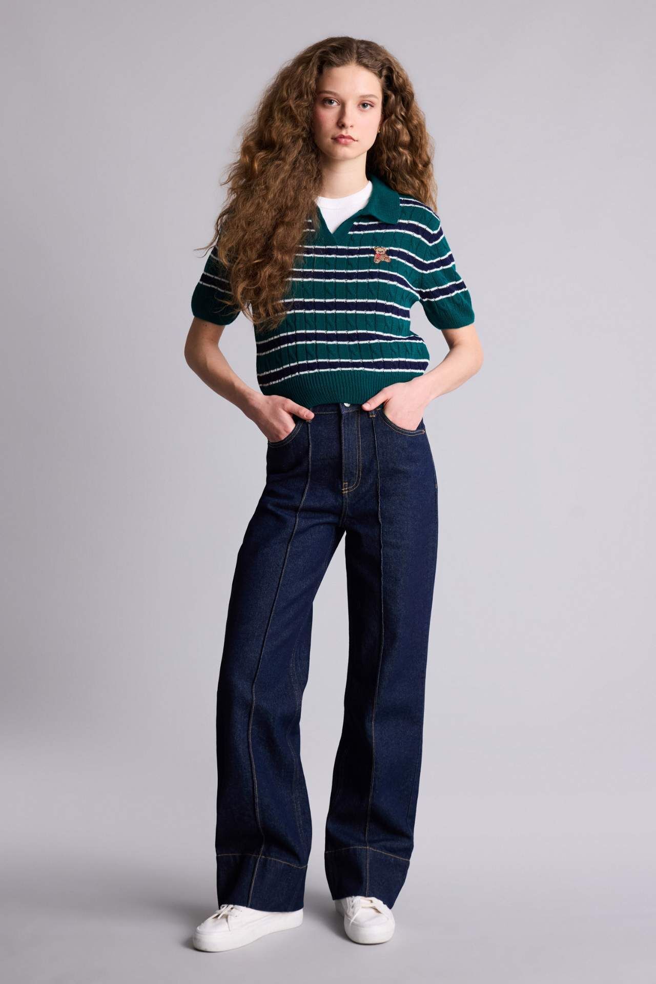 Slim Fit Ayıcıklı Çizgili Kazak, vücuda oturan kesimiyle zarif bir siluet sunarken sevimli ayıcık detayıyla enerjik bir dokunuş kazandırır. Çizgili tasarımı sayesinde modern ve dinamik bir görünüm sağlar. Günlük kombinlerinize hem sıcaklık hem stil katar. Akrilik 100% Manken Bedeni: Göğüs: 78 Boy: 1,74 Basen: 89 Bel: 60