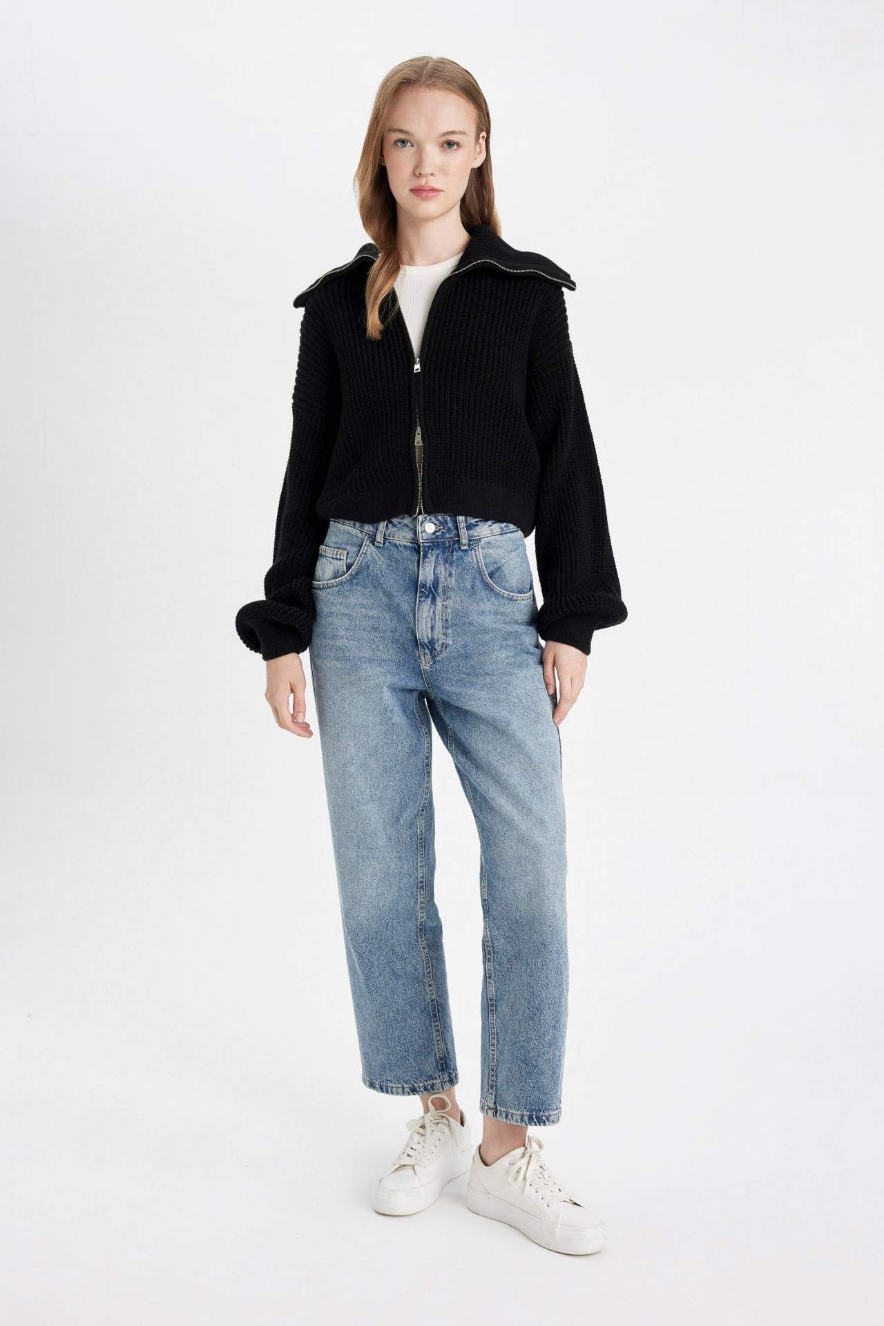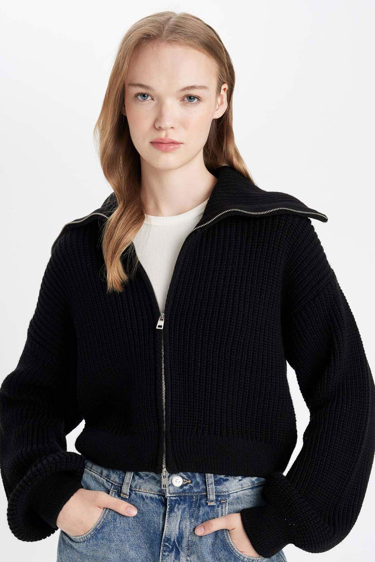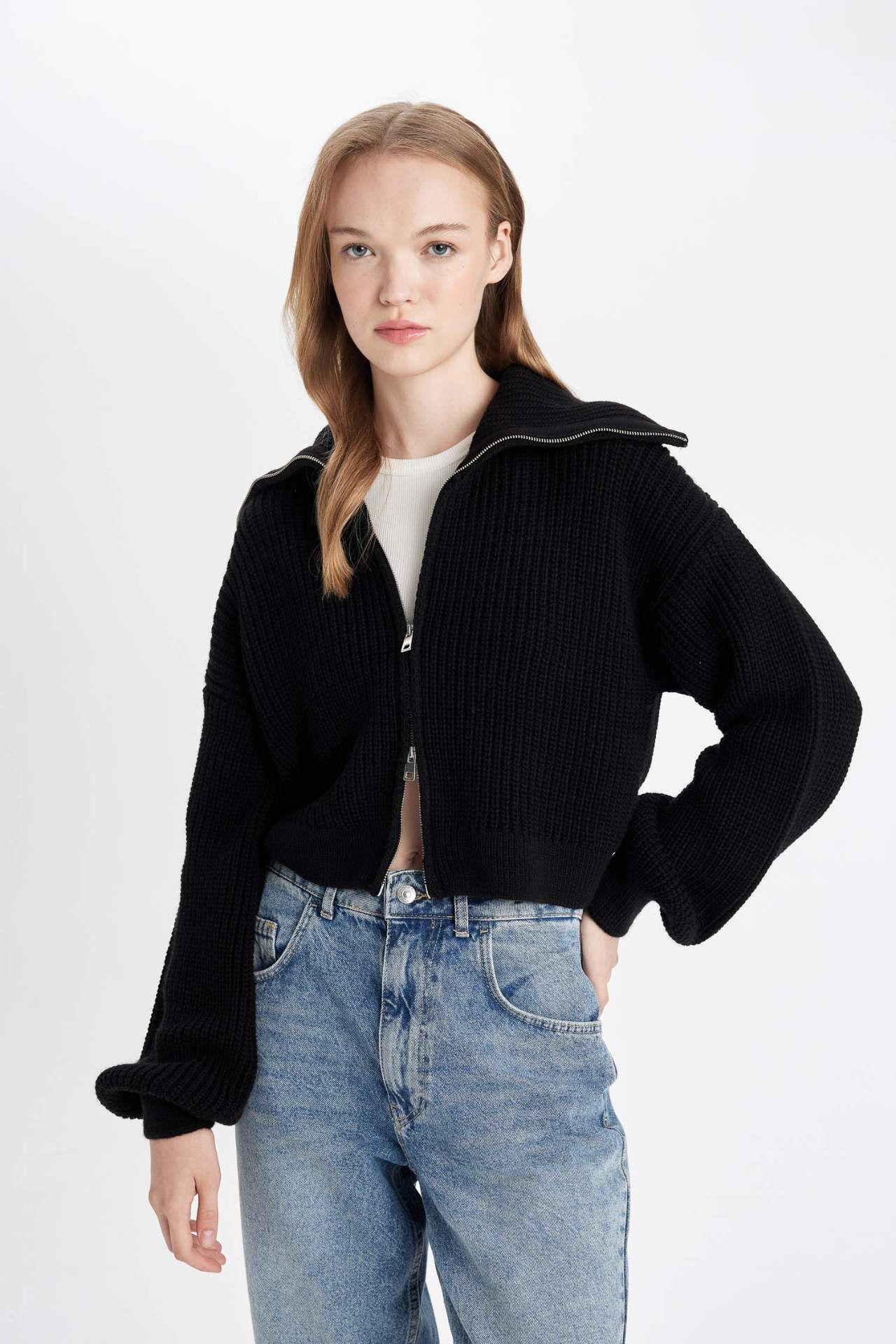 DeFacto Slim Fit Basic Dik Yaka Triko Fermuarlı Hırka A3333AX24WNBK27