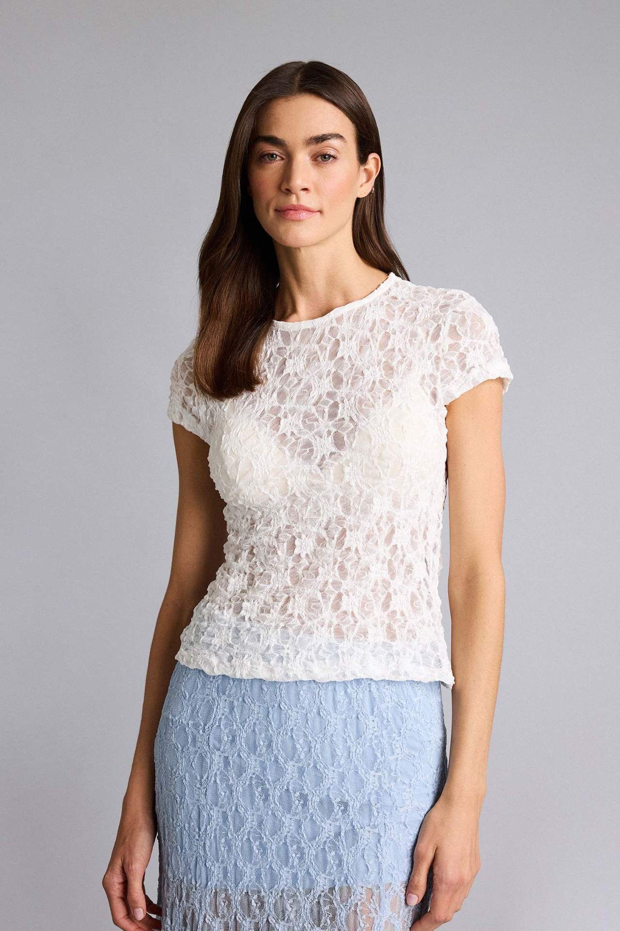 DeFacto Slım Fıt Bisiklet Yaka Dantel Kısa Kollu Tişört