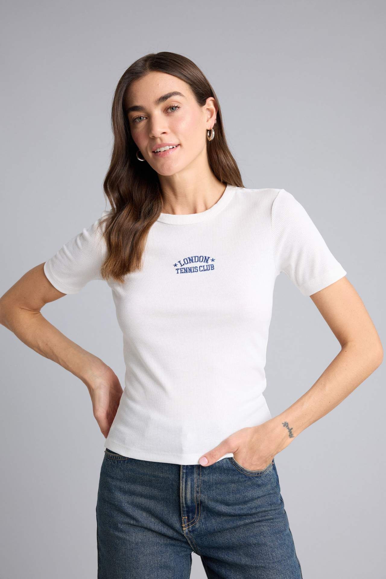 DeFacto Slım Fıt Bisiklet Yaka Nakış Baskı Baskılı Fitilli Kaşkorse Kısa Kollu Tişört