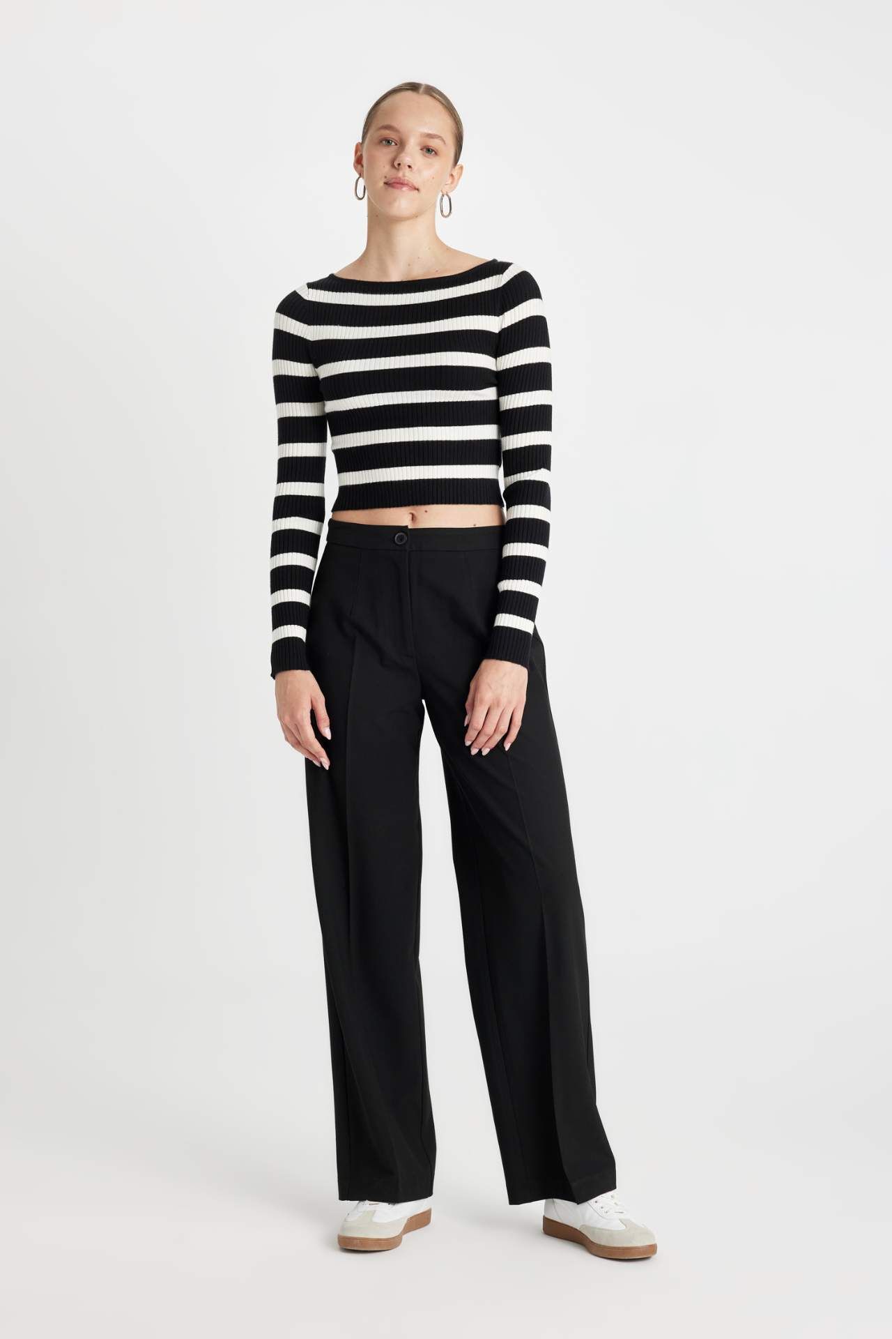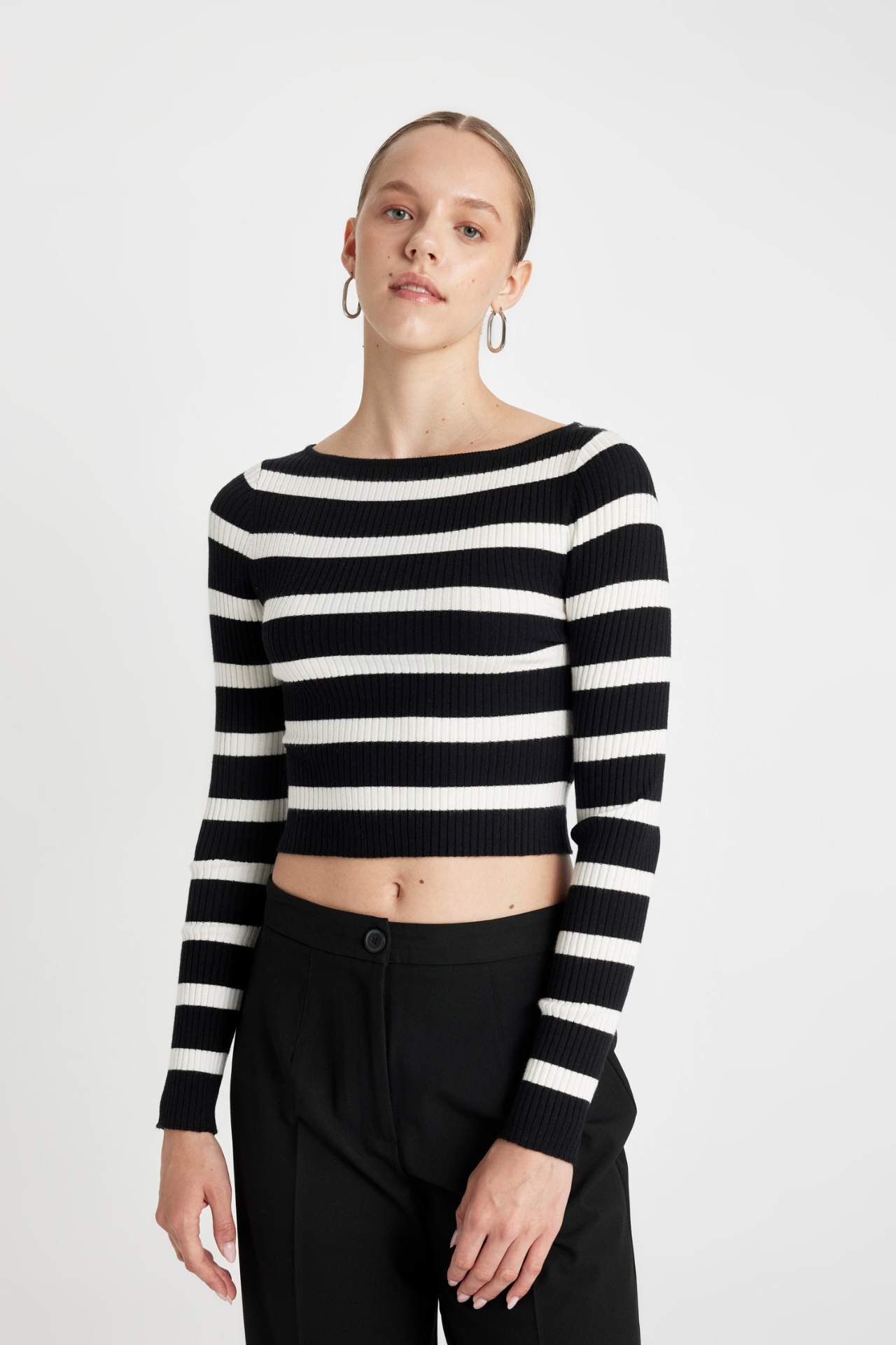 DeFactoFit Slim Fit Çizgili Kayık Yaka Kazak