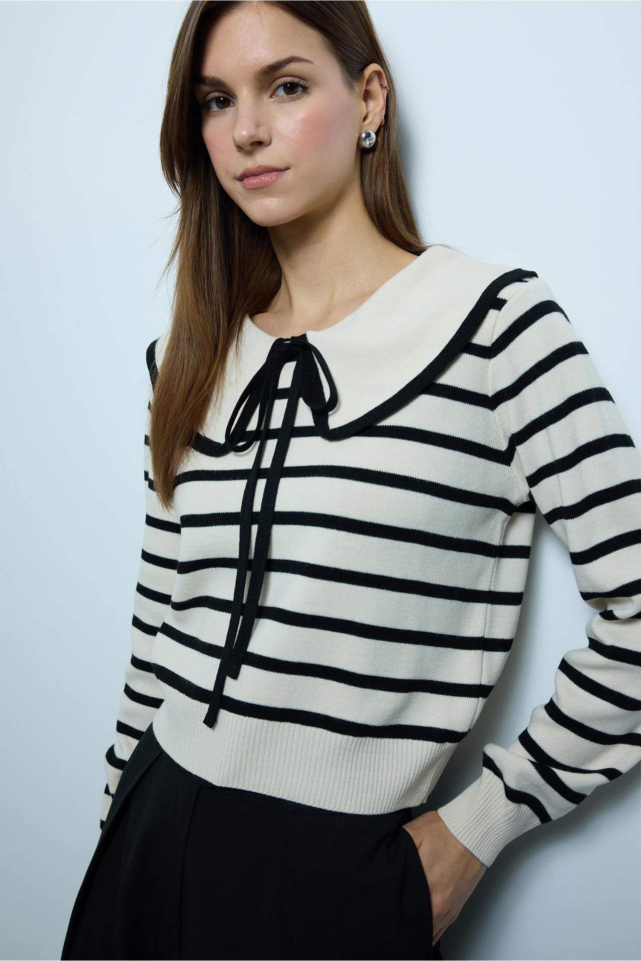 Slim fit dar kesim bebe yaka çizgili kazak, vücuda oturan kesimiyle şık ve modern bir görünüm sunar. Çizgili deseni ve bebe yaka detayı sayesinde kombinlere zarif bir hava katar. Akrilik 100% Manken Bedeni: Göğüs: 84 Boy: 1,75 Basen: 89 Bel: 59