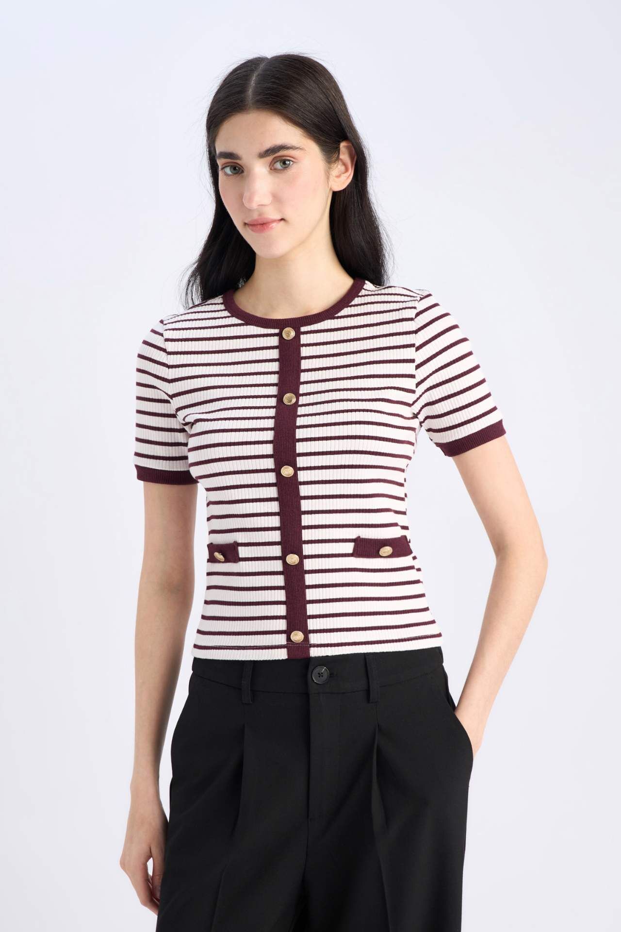 DeFacto Slim Fit Dar Kesim Bisiklet Yaka Çizgili Fitilli Kaşkorse Kısa Kollu Tişört