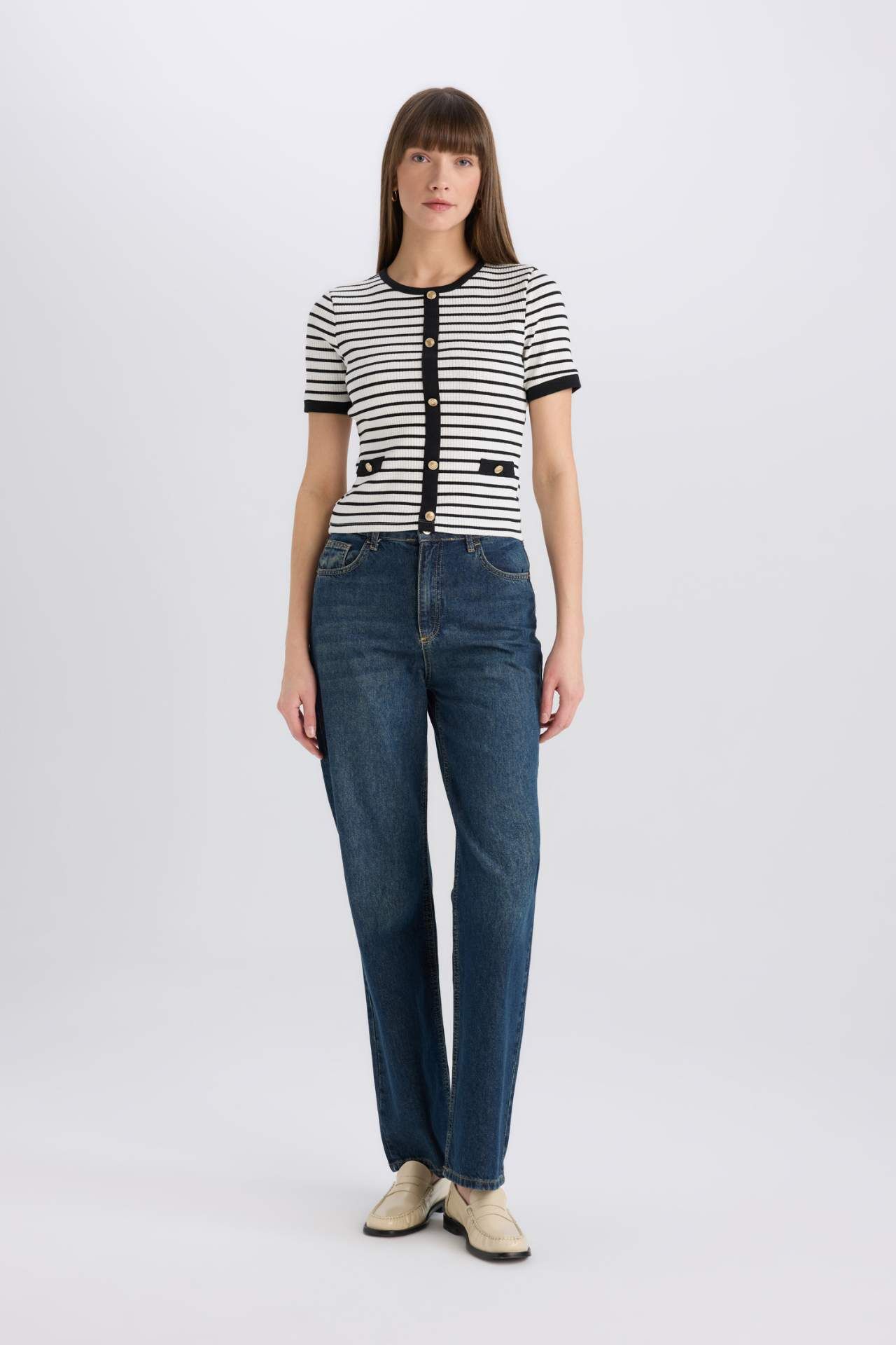 DeFacto Slim Fit Dar Kesim Bisiklet Yaka Çizgili Smart Fitilli Kaşkorse Düğmeli Kısa Kollu Tişört