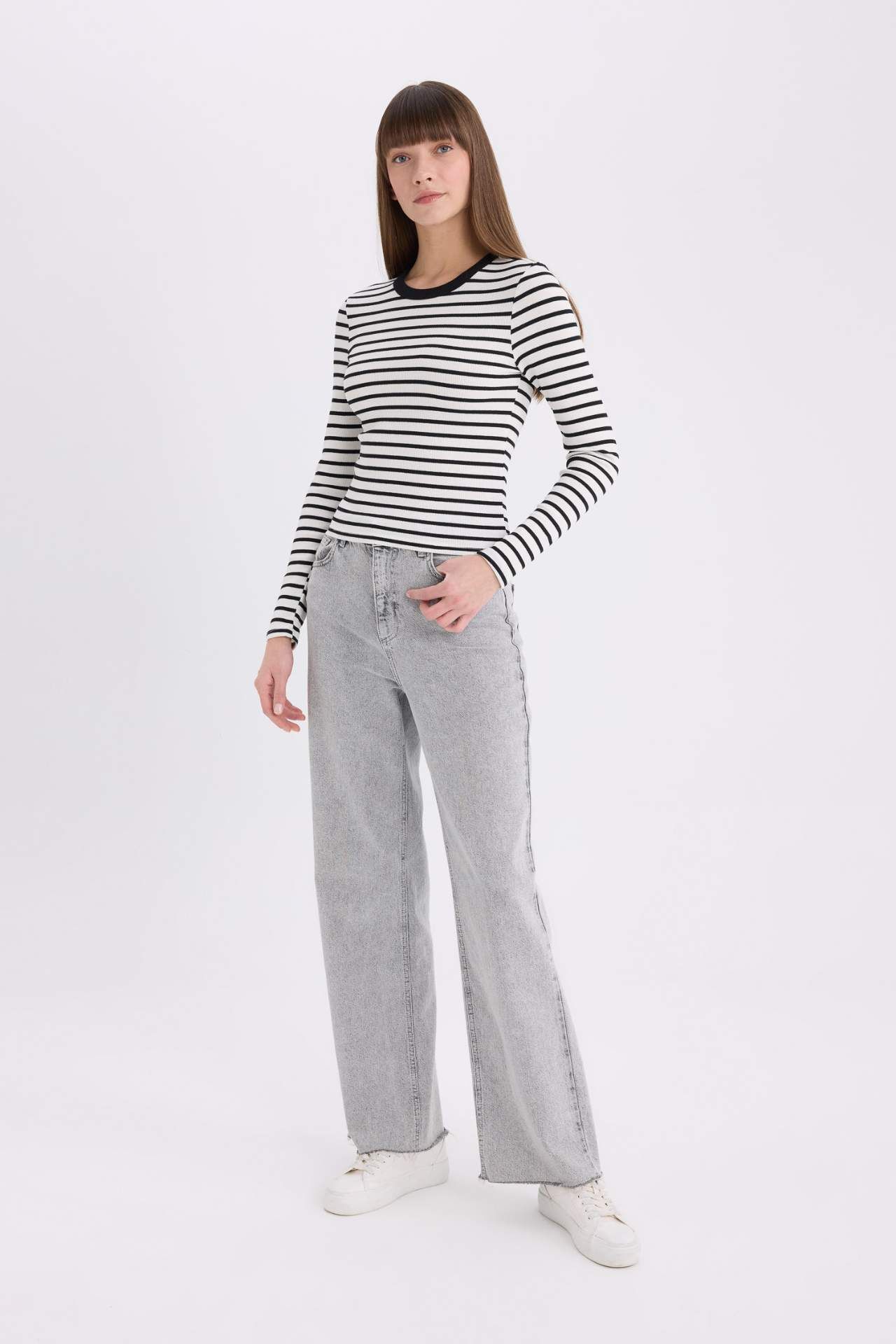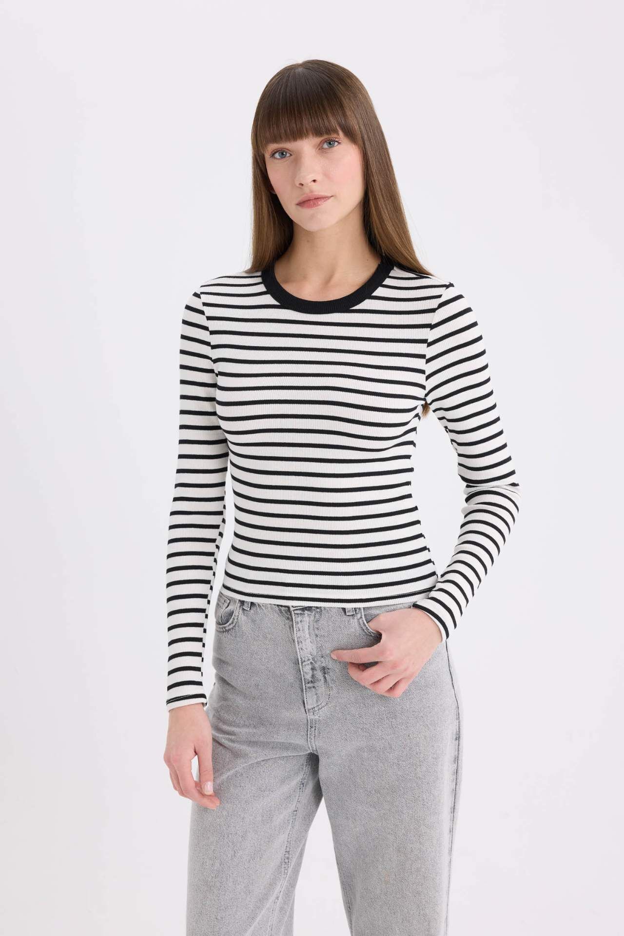 DeFacto Slim Fit Dar Kesim Bisiklet Yaka Çizgili Uzun Kollu Tişört