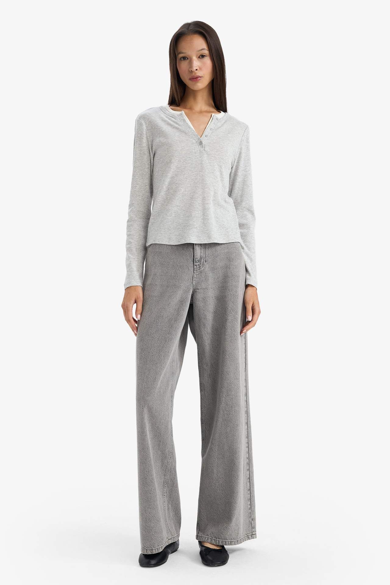 Slim Fit Dar Kesim Düğmeli Yaka Ribana Uzun Kollu Tişört