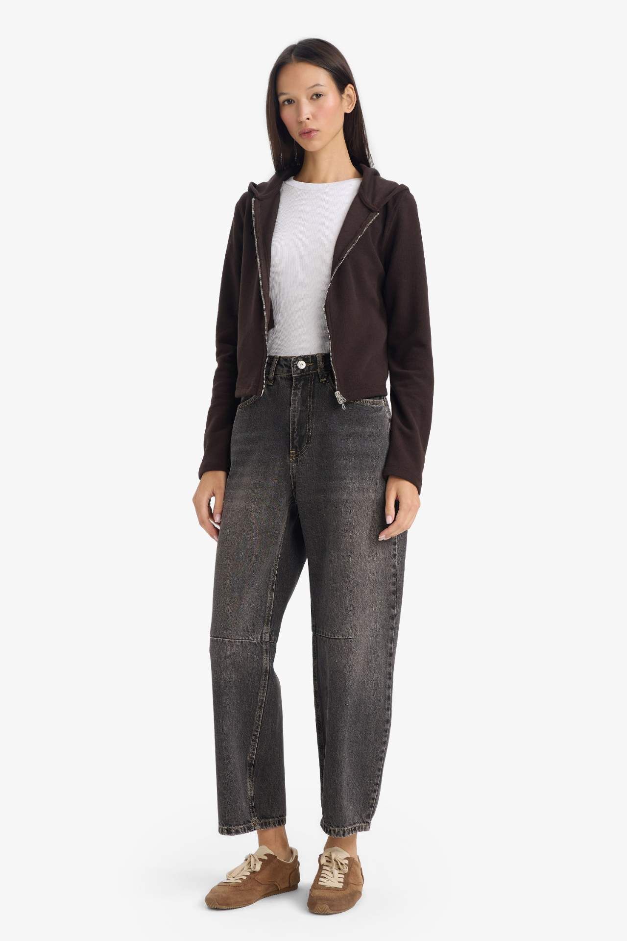Slim fit ve dar kesimiyle bu kapüşonlu fermuarlı sweatshirt, şık ve modern bir siluet sunar. Yumuşak kumaşı ve pratik fermuar detayıyla gün boyu konforlu kullanım sağlar. Pamuk 49%,Poliester 51%,Pamuk 49%,Poliester 51% Manken Bedeni: Göğüs: 0 Boy: 1,78 Basen: 0 Bel: 0