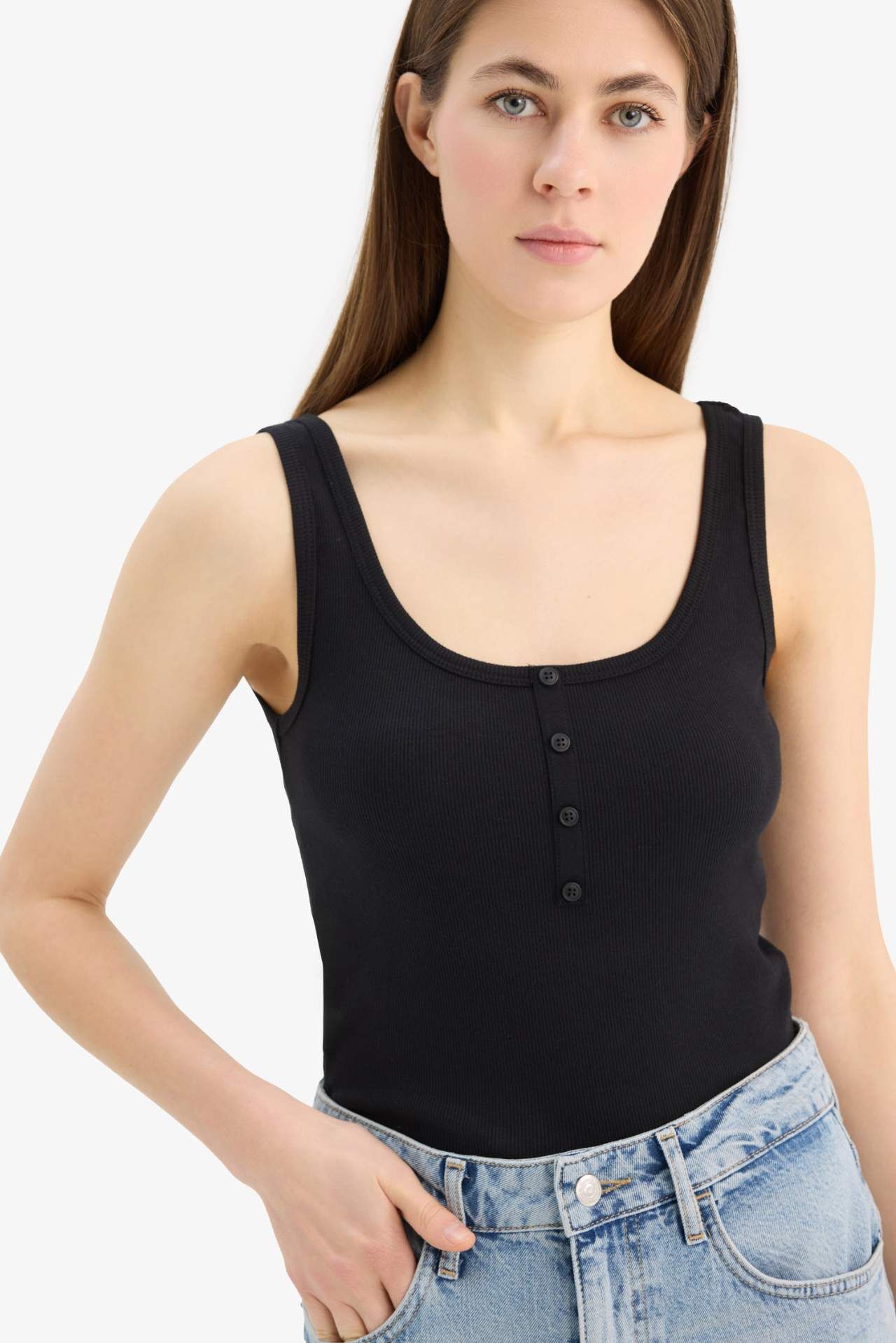 DeFacto Slim Fit Dar Kesim Kare Yaka Fitilli Kaşkorse Atlet E2173AX25SPBK81
