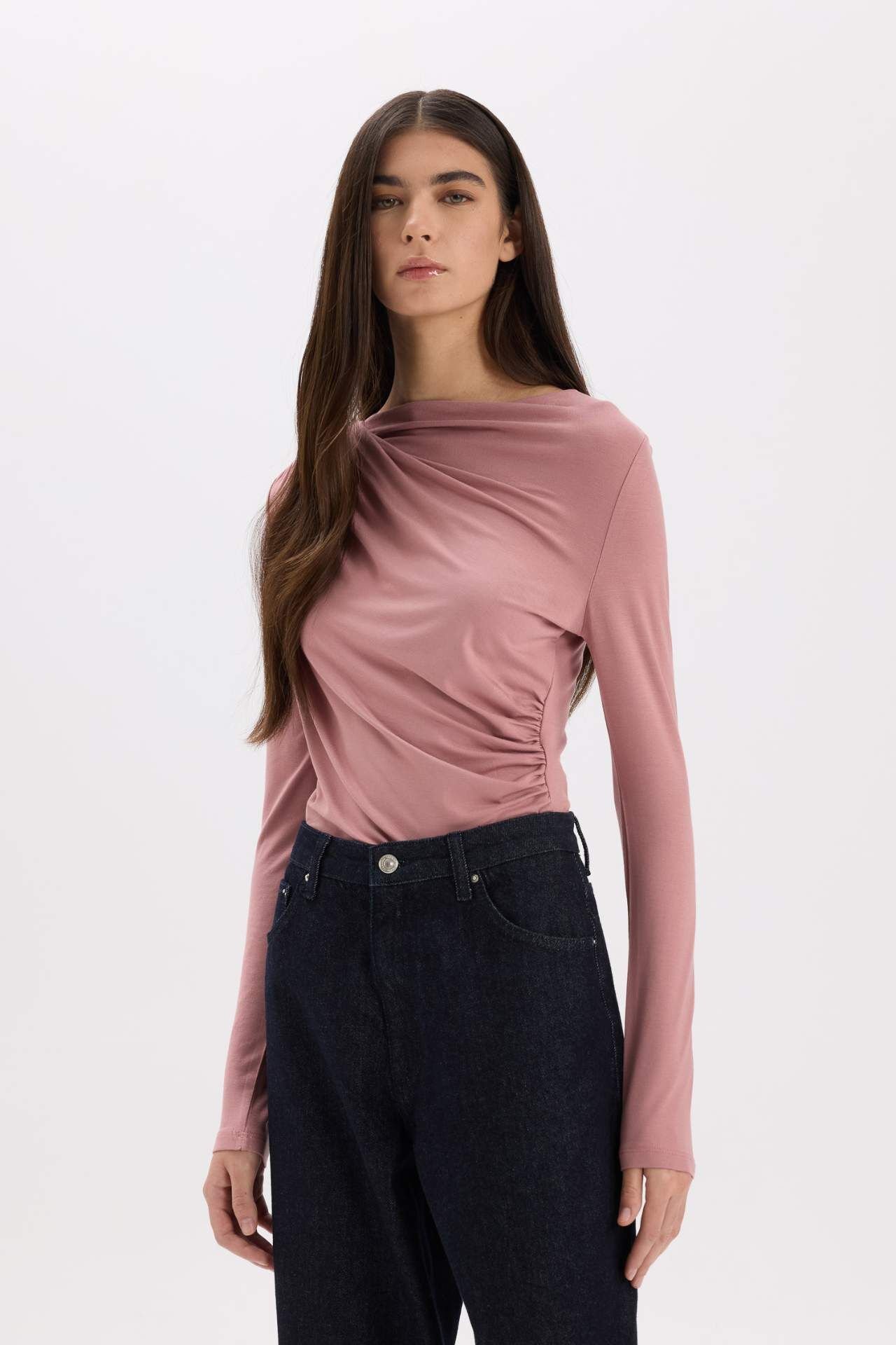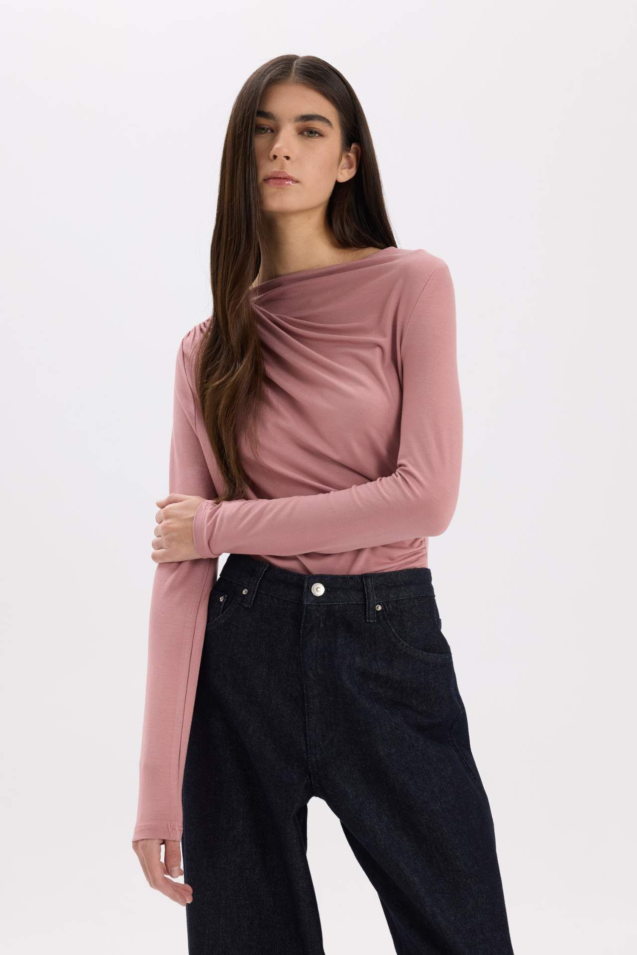 DeFacto Slim Fit Dar Kesim Kayık Yaka Basic Düz Uzun Kollu Bluz