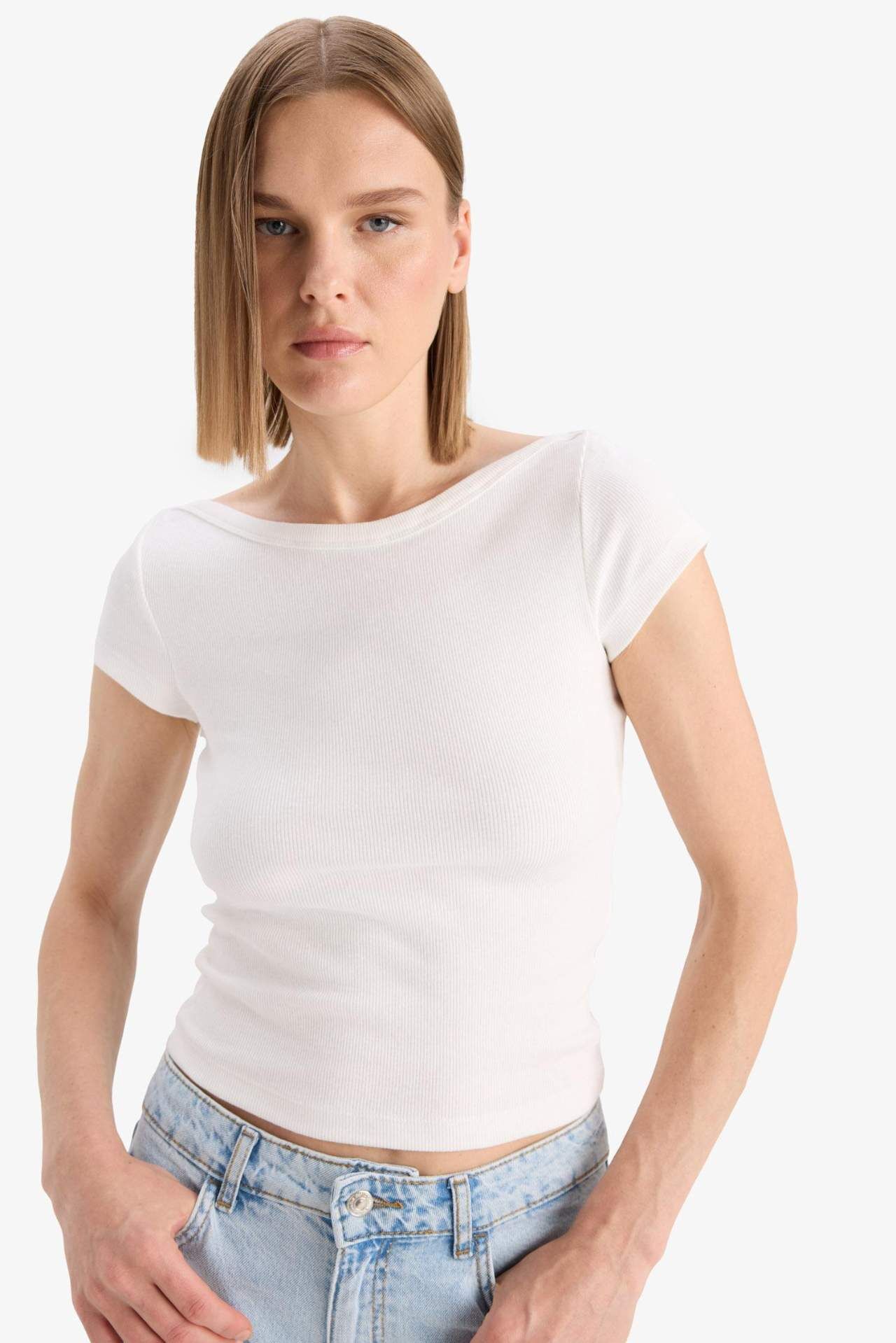 DeFacto Slim Fit Dar Kesim Kayık Yaka Fitilli Kaşkorse Kısa Kollu Tişört F5015AX25SMER105