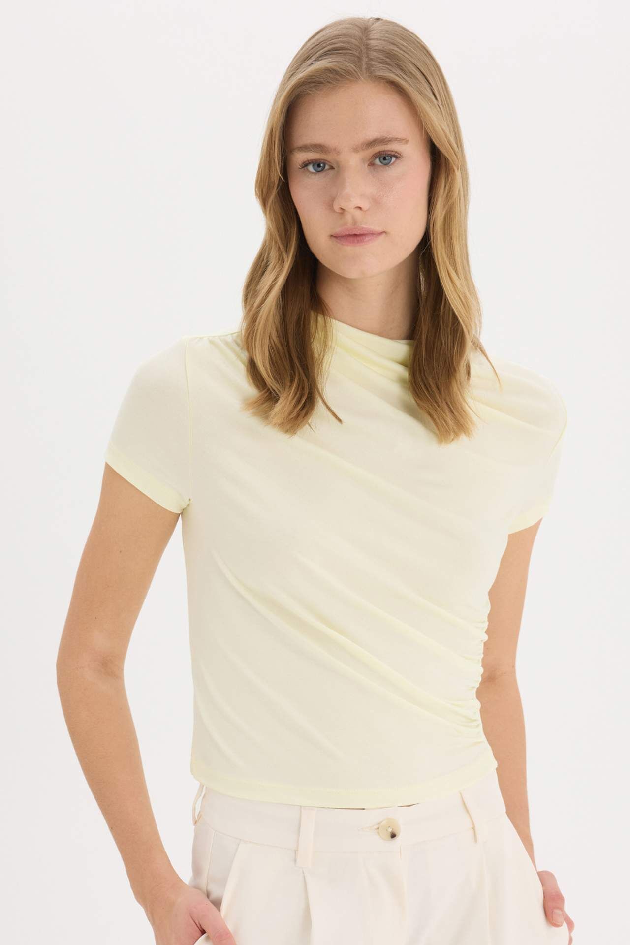 Yetişkin kadınlar için özel olarak tasarlanmış Slim Fit Dar Kesim Ekru kısa kollu tişört. Sonbahar/Kış koleksiyonunun temel parçası olan bu tişört, örme kumaşıyla şıklığı ve rahatlığı bir araya getiriyor. Kayık yaka detayıyla da fark yaratıyor. Elastan 5%,Viskoz 95%,Elastan 5%,Viskoz 95%,Elastan 5%,Viskoz 95%,Elastan 5%,Viskoz 95%,Elastan 5%,Viskoz 95% Manken Bedeni: Göğüs: 0 Boy: 0 Basen: 0 Bel: 0