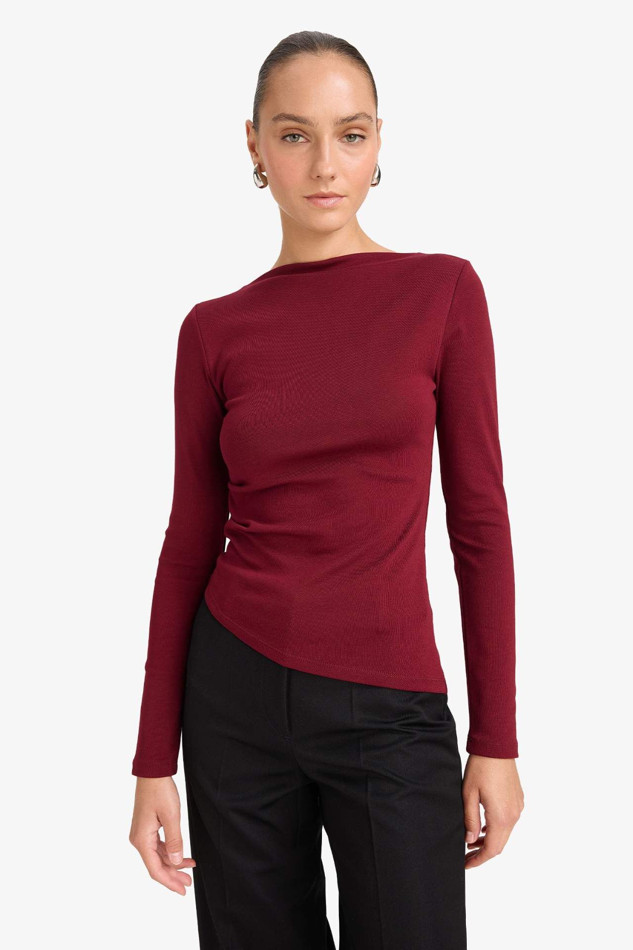 Slim Fit Dar Kesim Kayık Yaka Ribana Uzun Kollu Tişört G1581AX25AUBR115