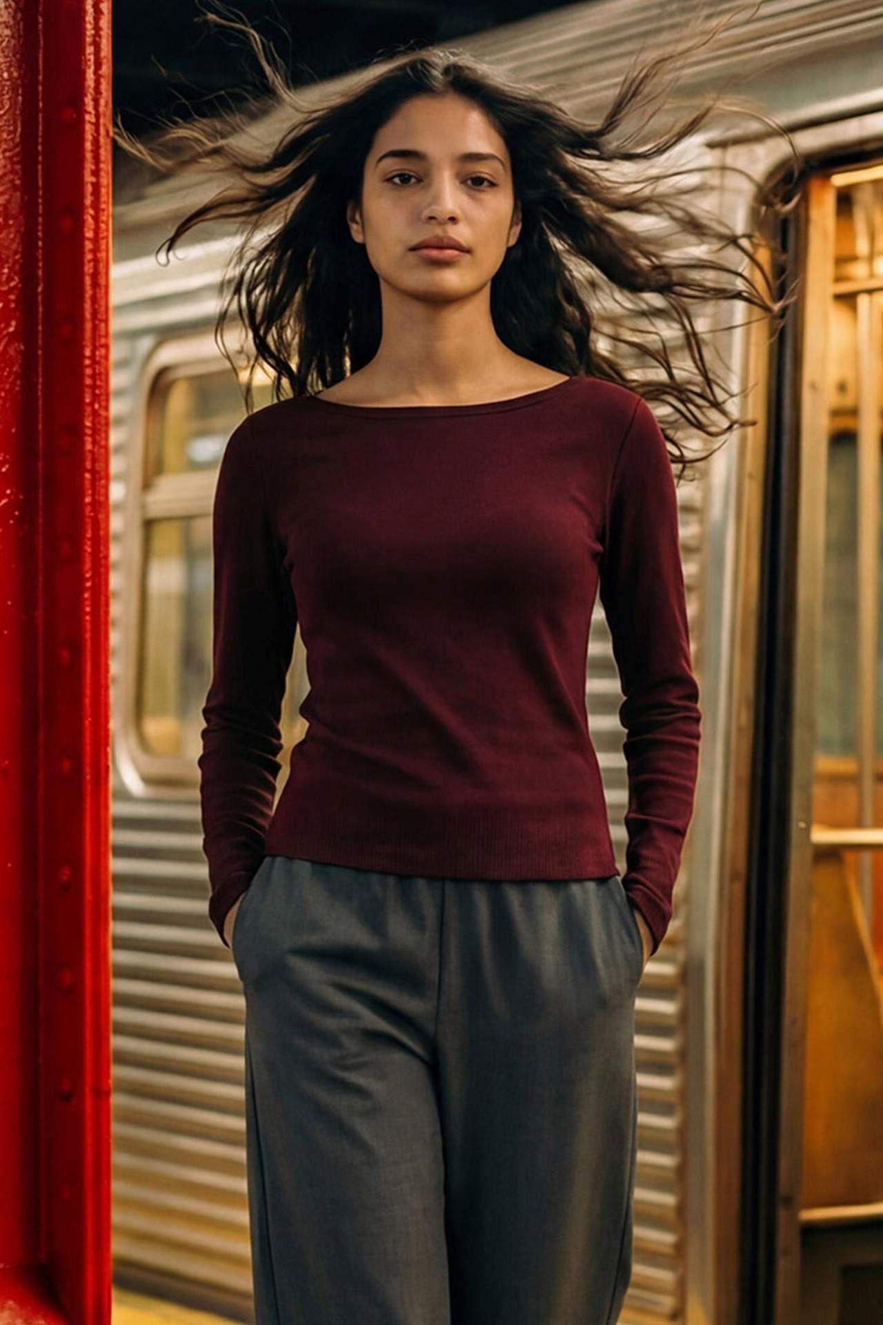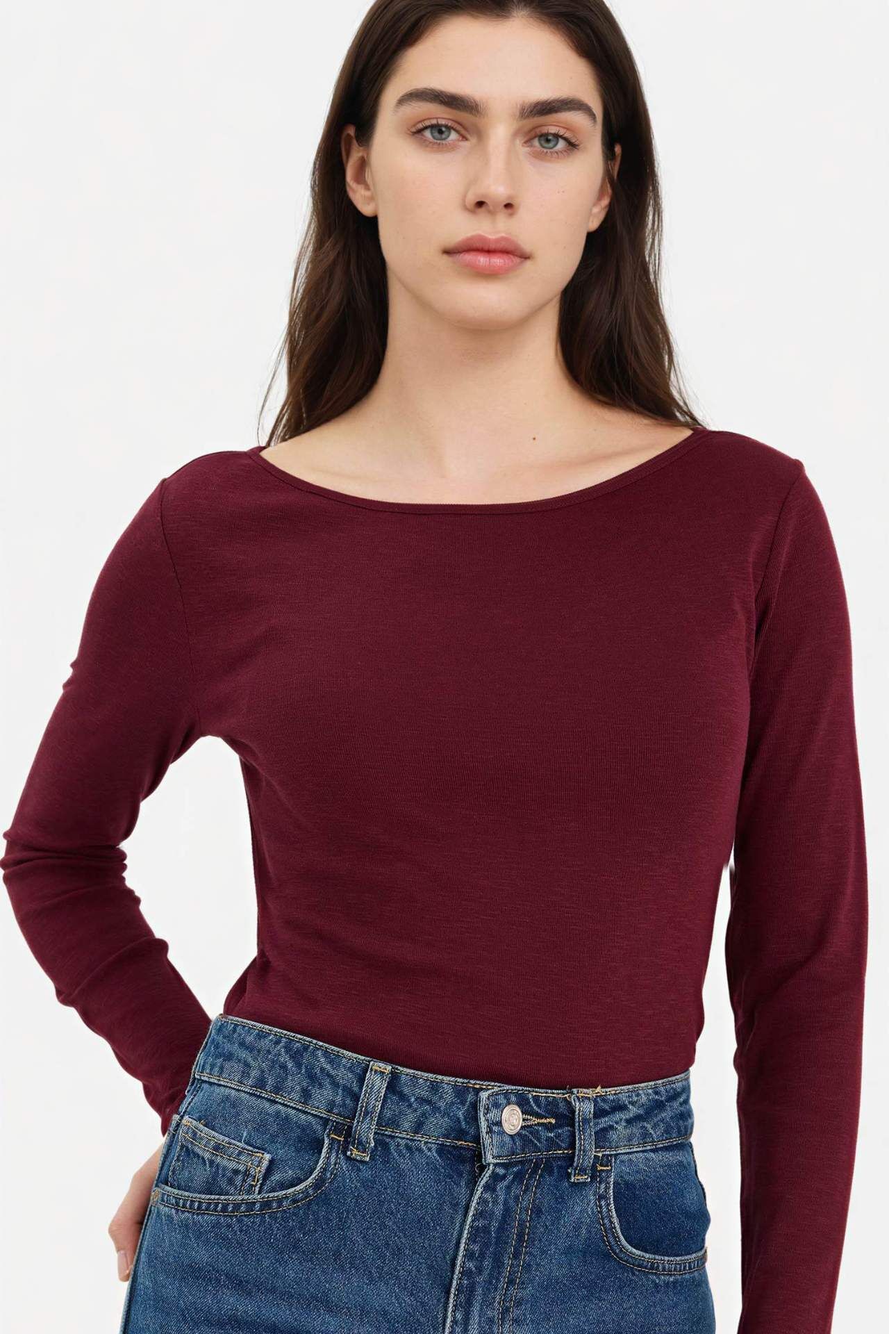Slım Fıt Dar Kesim Kayık Yaka Ribana Uzun Kollu Tişört