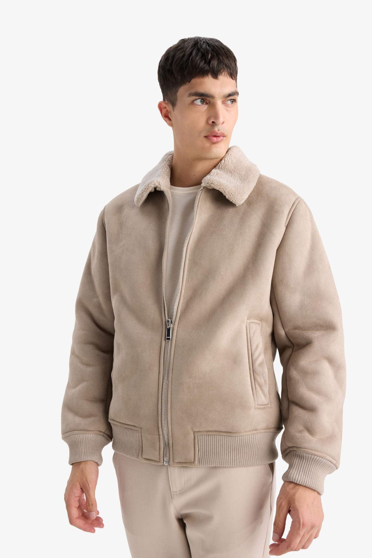 Slim Fit Dar Kesim Kürklü Polo Yaka Astarlı Fermuarlı Cepli Süet Mont