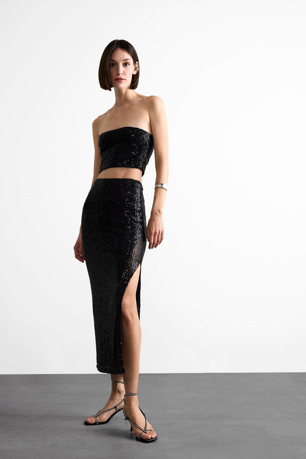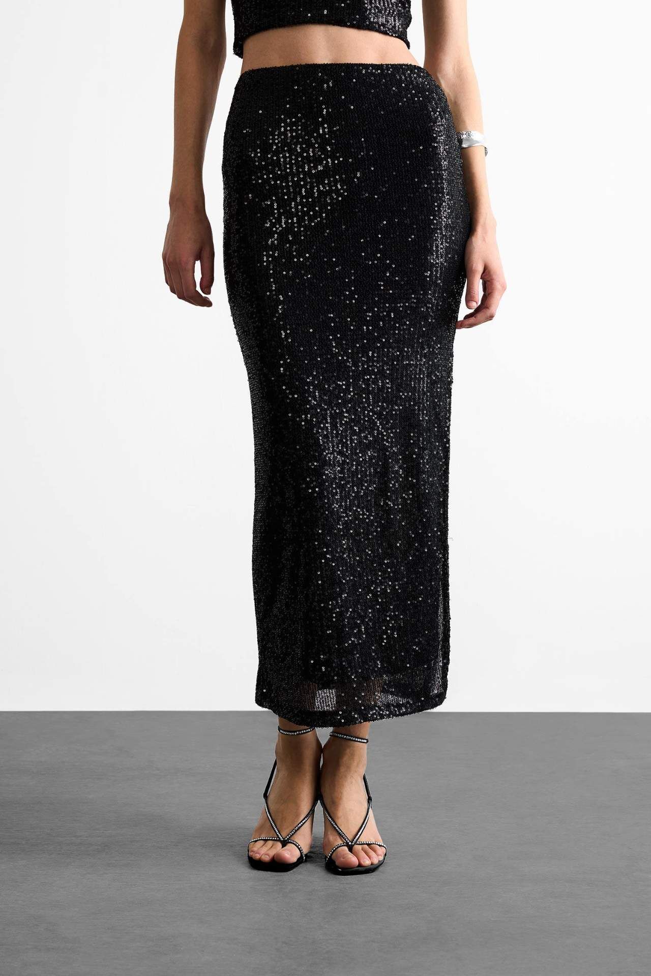 DeFacto Slim Fit Dar Kesim Payetli Yırtmaçlı Midi Etek