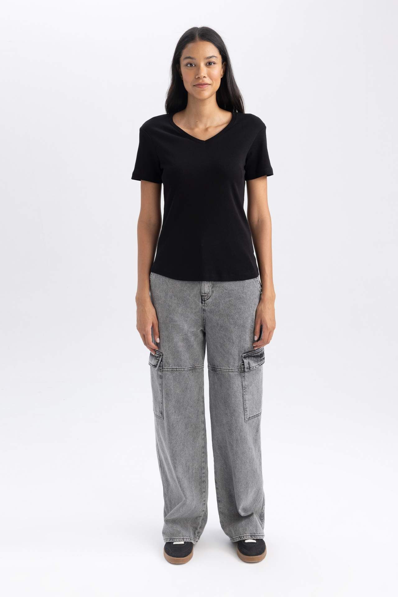 DeFacto Slim Fit Dar Kesim Ribana Kısa Kollu Tişört B0647AXNSBK81