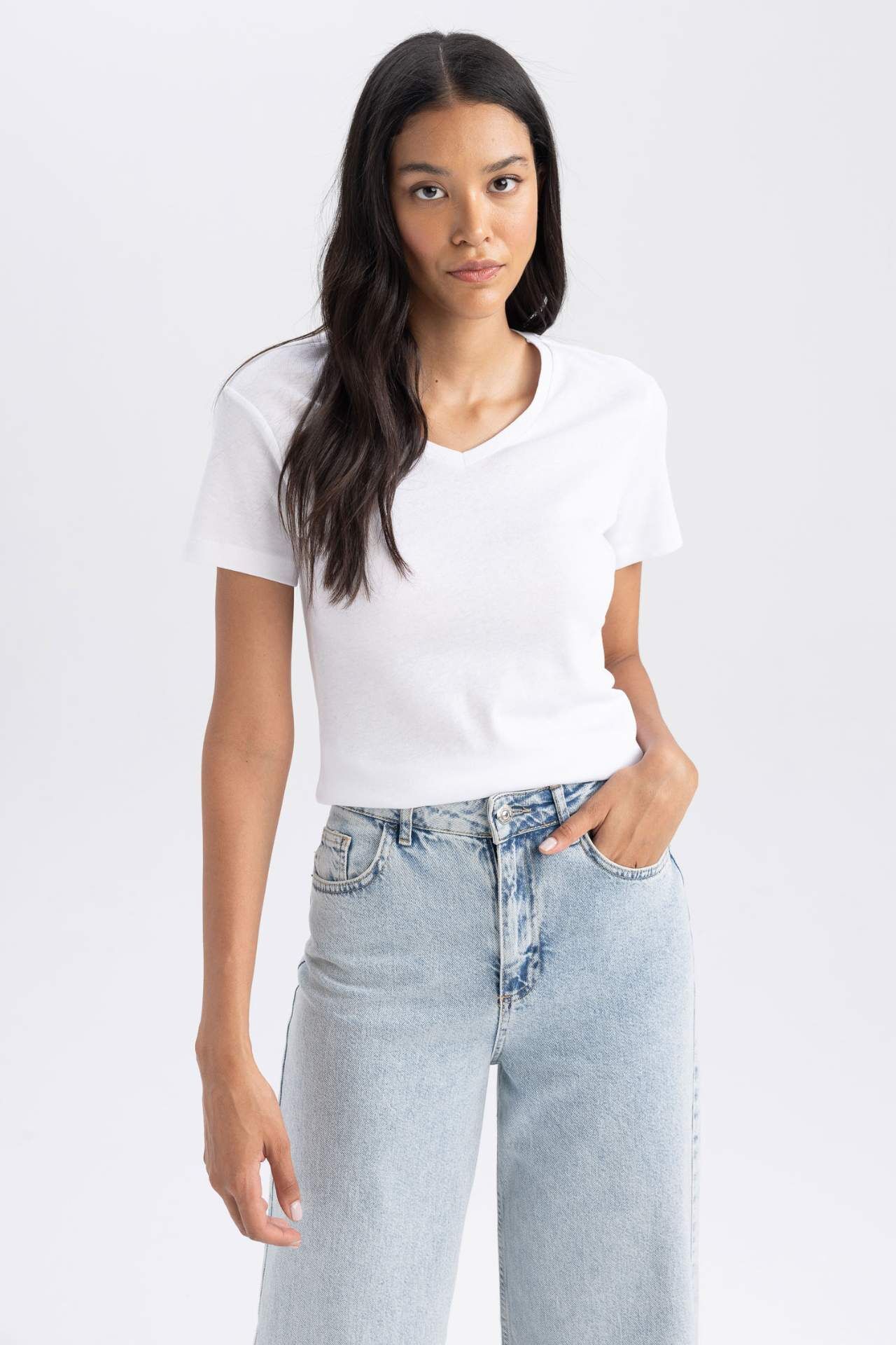 DeFacto Slim Fit Dar Kesim Ribana Kısa Kollu Tişört B0647AXNSWT34