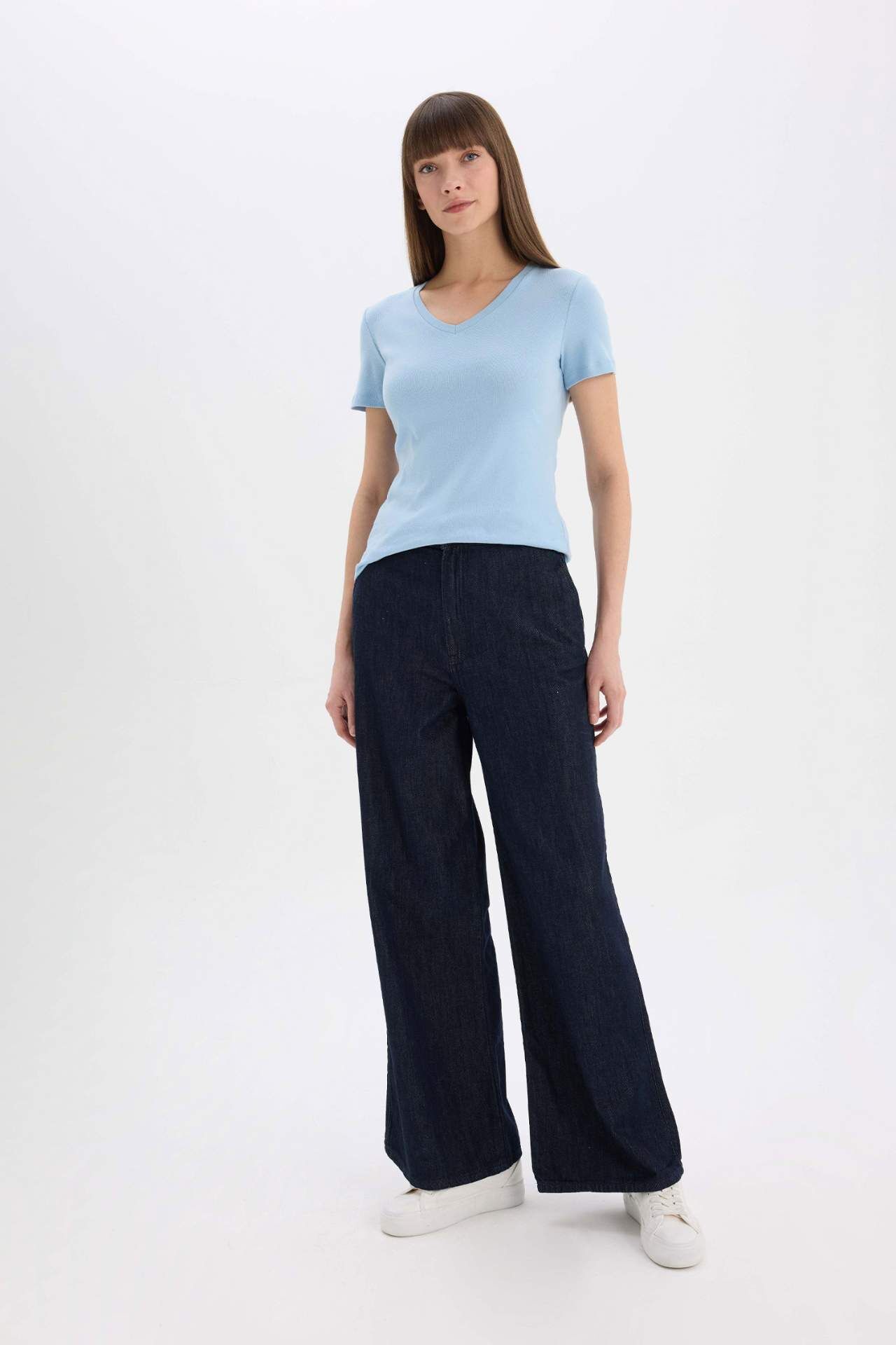 DeFacto Slim Fit Dar Kesim V Yaka Basic Düz Casual Ribana Kısa Kollu Tişört I1080AZ25SPBE196