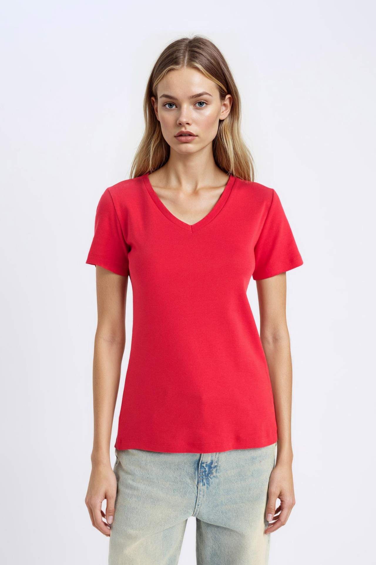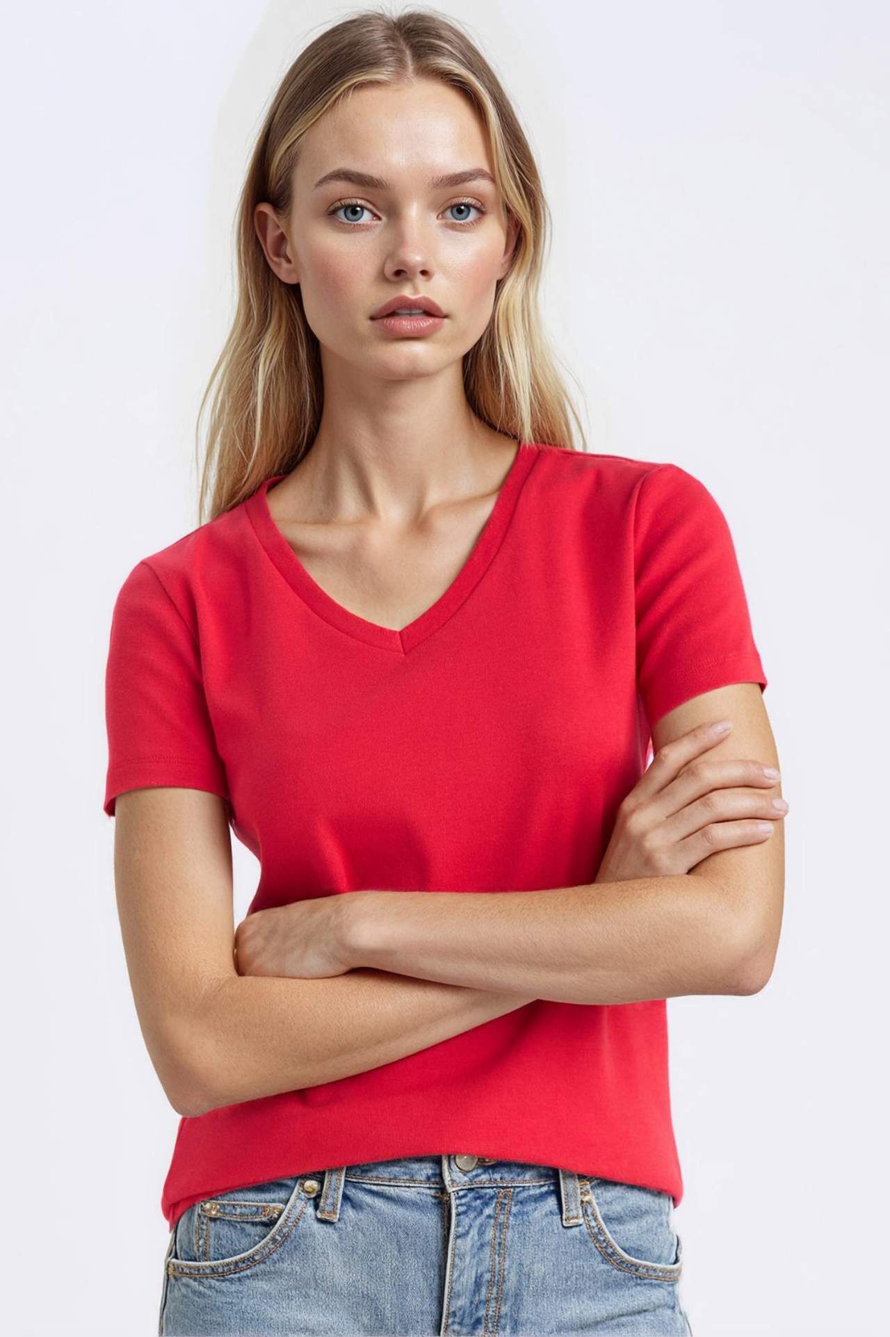DeFacto Slim Fit Dar Kesim V Yaka Basic Düz Ribana Kısa Kollu Tişört I1080AZ25SPRD286
