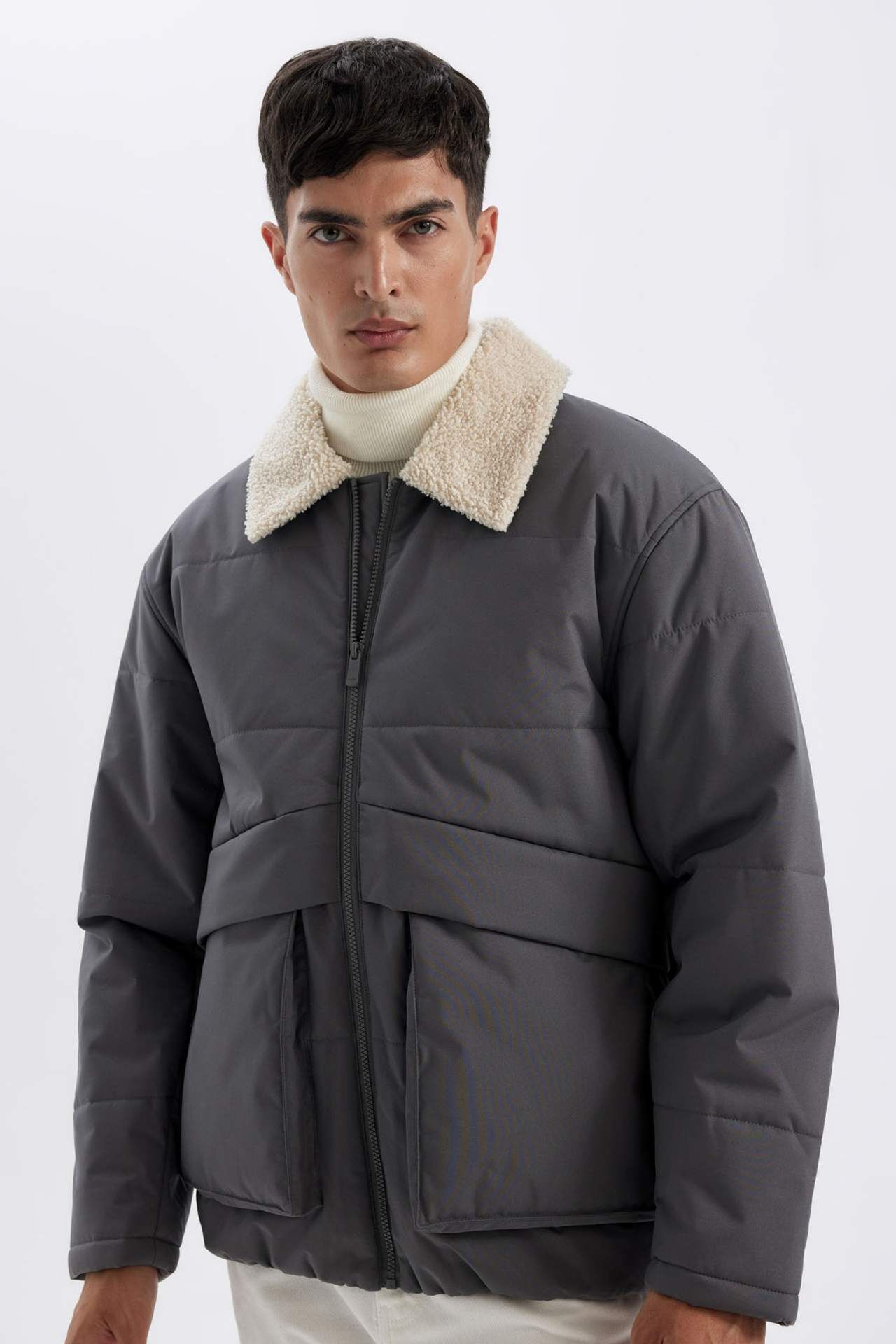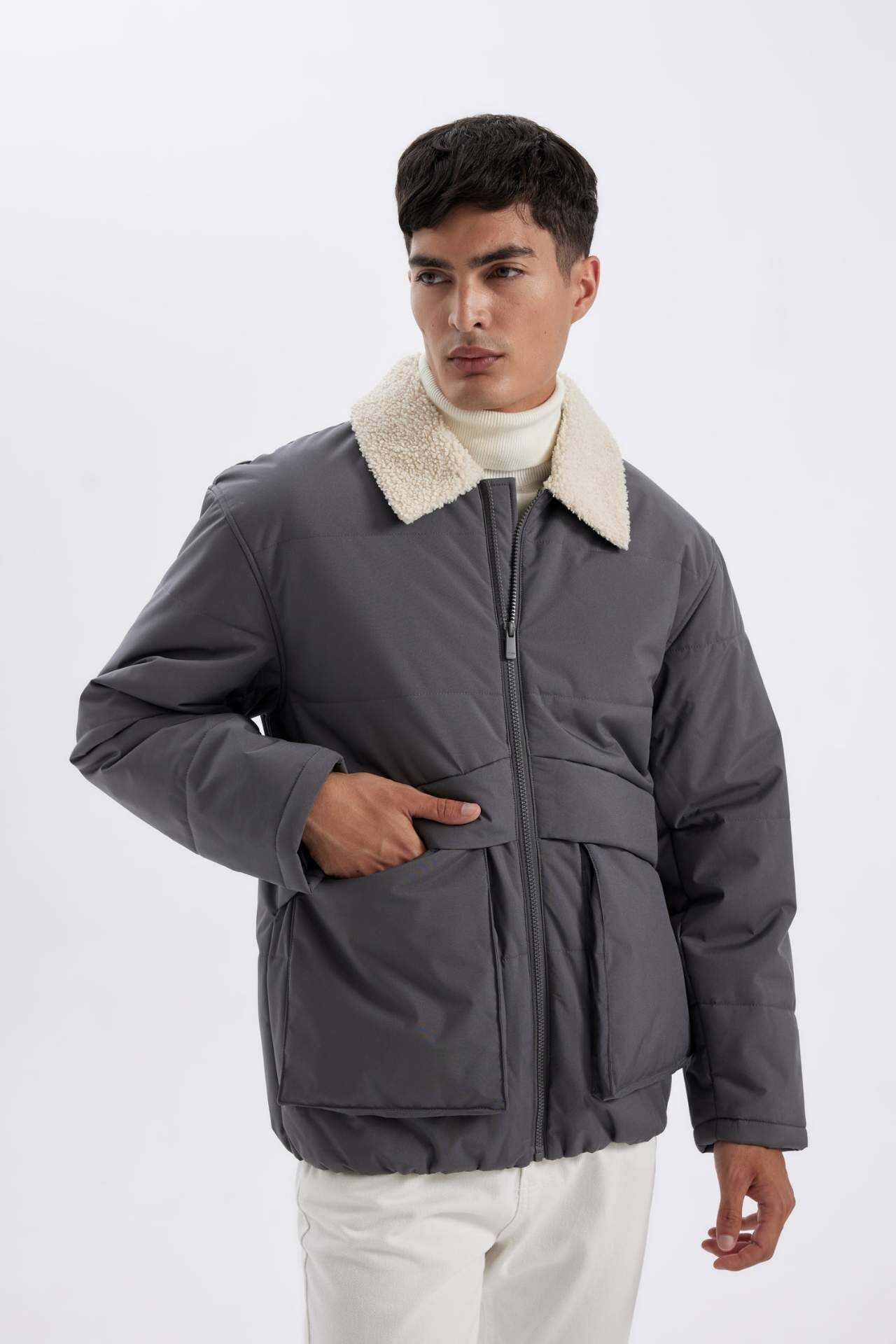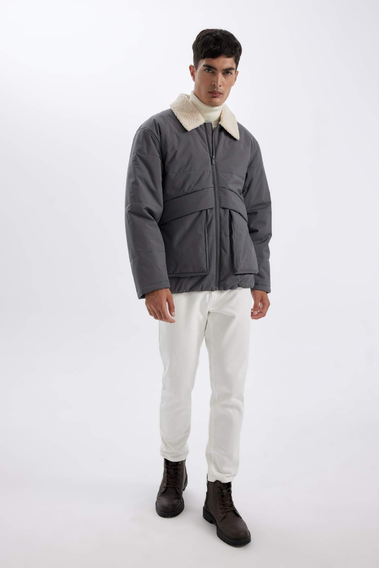 Slim Fit Fermuarlı Mont Dar Kesim Polo Suni Kürk Yaka Cepli