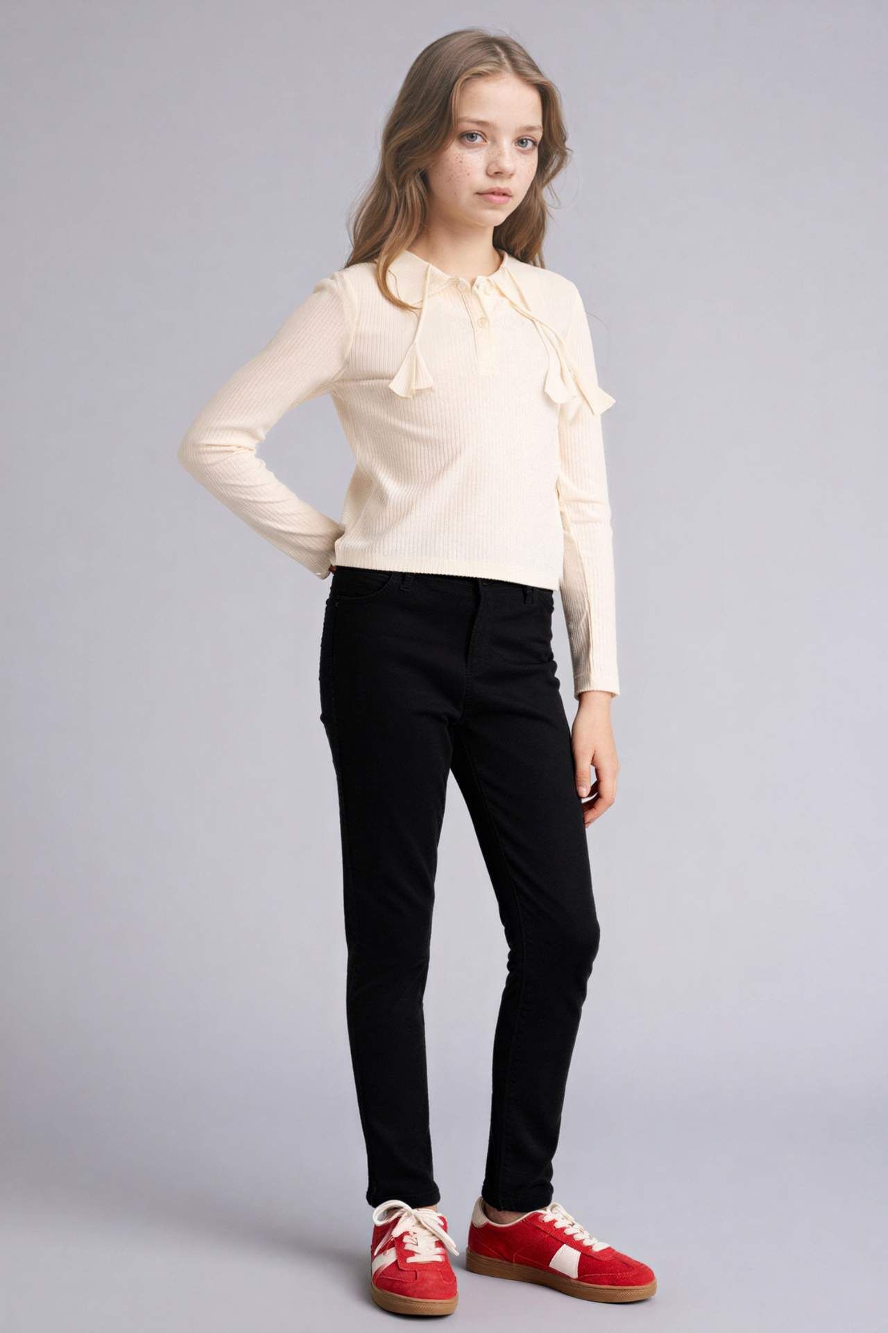Slım Fıt Polo Yaka Fitilli Kaşkorse Uzun Kollu Polo Tişört Kız Çocuk