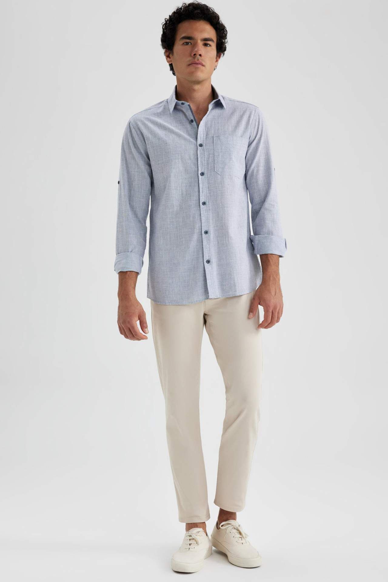 DeFacto Slim Fit Polo Yaka Keten Görünümlü Uzun Kollu Gömlek İndigo