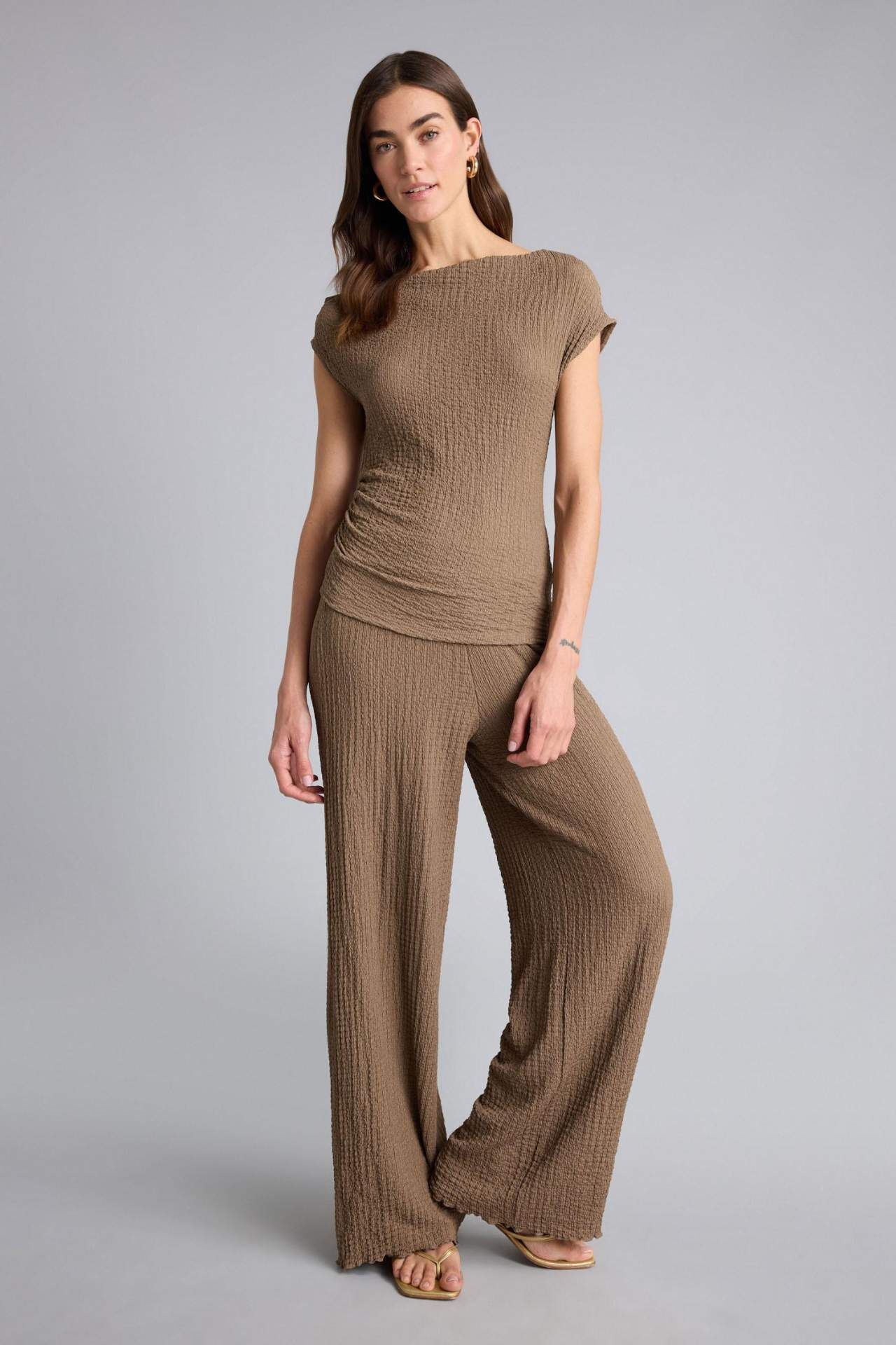 Yetişkin kadınlar için özel olarak tasarlanan bu örme kısa kollu tişört, slim fit kalıbı ve düşük omuz detayıyla dikkat çekiyor. Kahve rengi ve bürümcük kumaşıyla öne çıkan bu temel parça, ilkbahar/yaz mevsim koşullarına uygun bir seçenektir. Tek omuzlu yaka tasarımıyla şık ve rahat bir tarz sunar. Elastan 1%,Poliester 99% Manken Bedeni: Göğüs: 89 Boy: 1,78 Basen: 92 Bel: 63