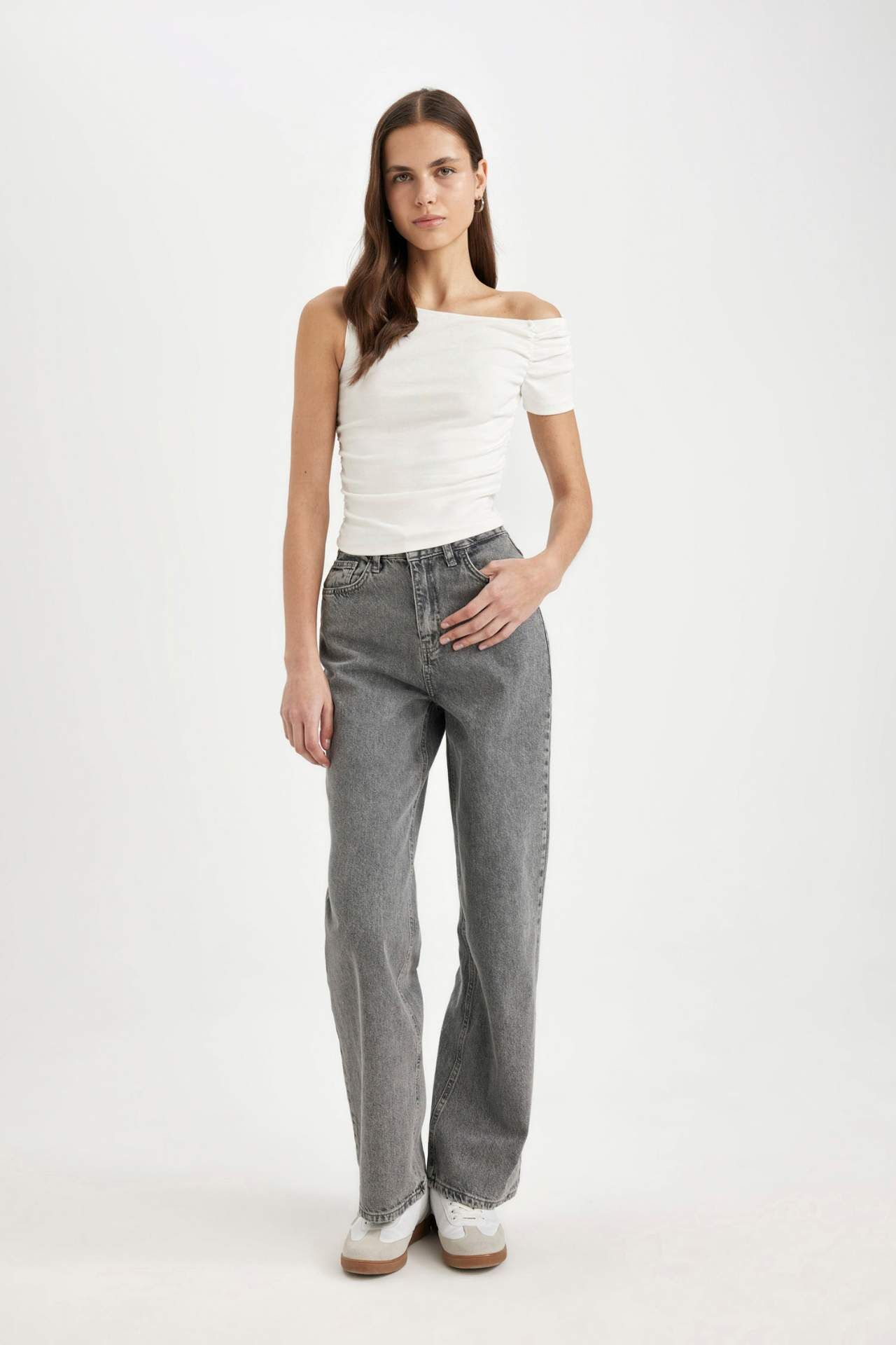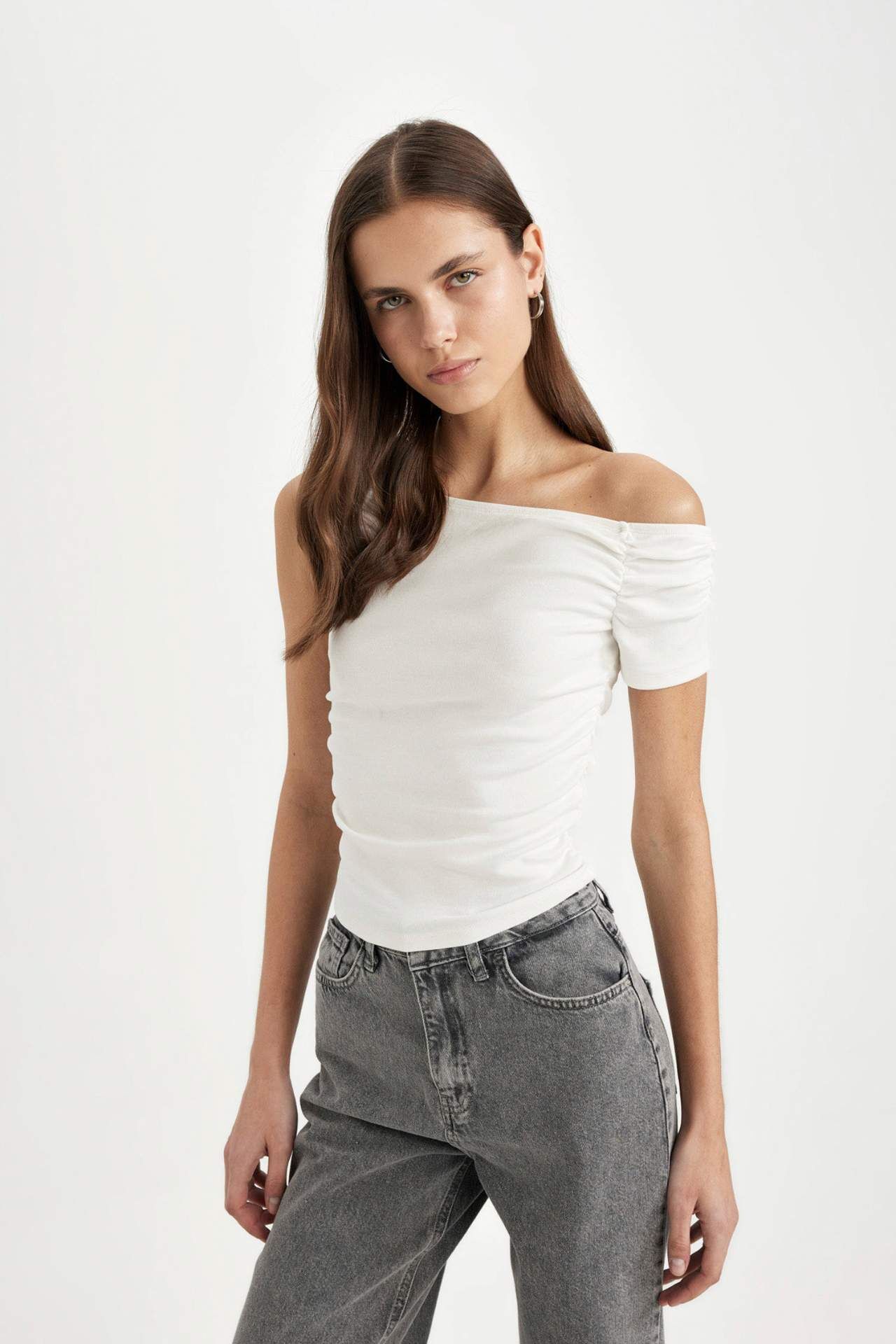 Yaz aylarının vazgeçilmezi olan beyaz renkli kadın kısa kollu tişört, slim fit dar kesim kalıbıyla öne çıkıyor. Sürdürülebilir ribana kumaştan üretilmiştir. Tek omuzlu tasarımıyla trend bir görünüm sunar. Örme giyim grubuna yönelik temel bir seçenektir. Pamuk 96%,Elastan 4%,Pamuk 96%,Elastan 4% Manken Bedeni: Göğüs: 80 Boy: 1,76 Basen: 89 Bel: 60