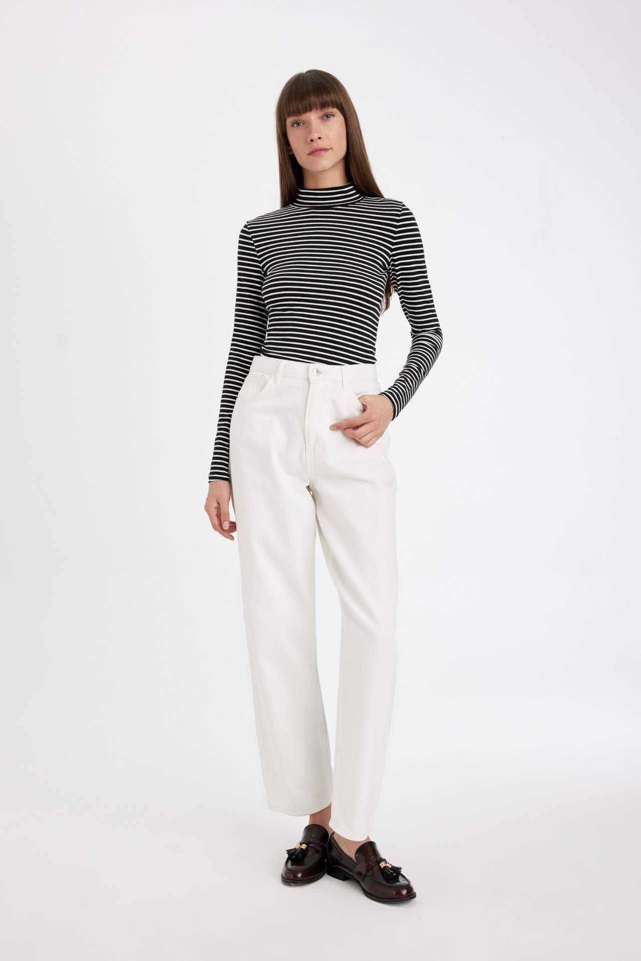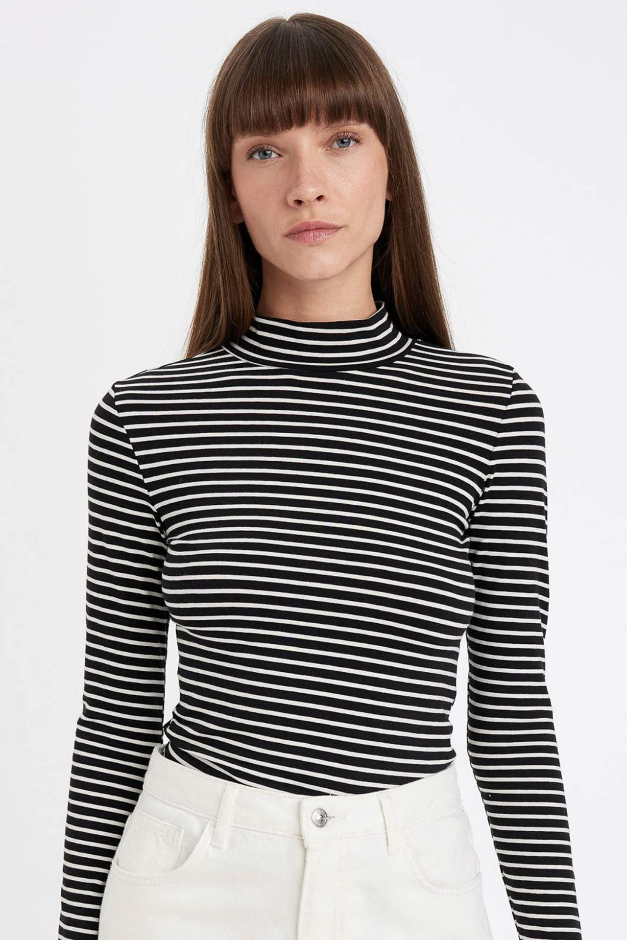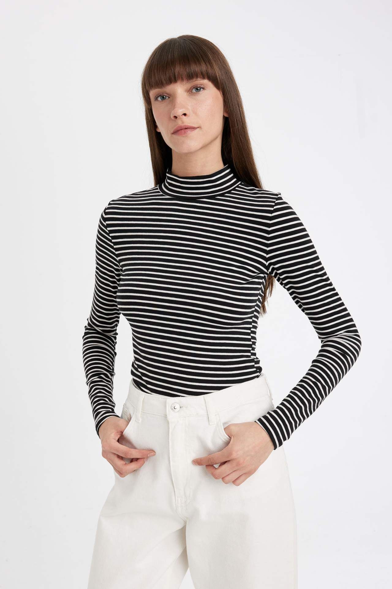 DeFacto Slim Fit Yarım Balıkçı Yaka Çizgili Uzun Kollu Tişört