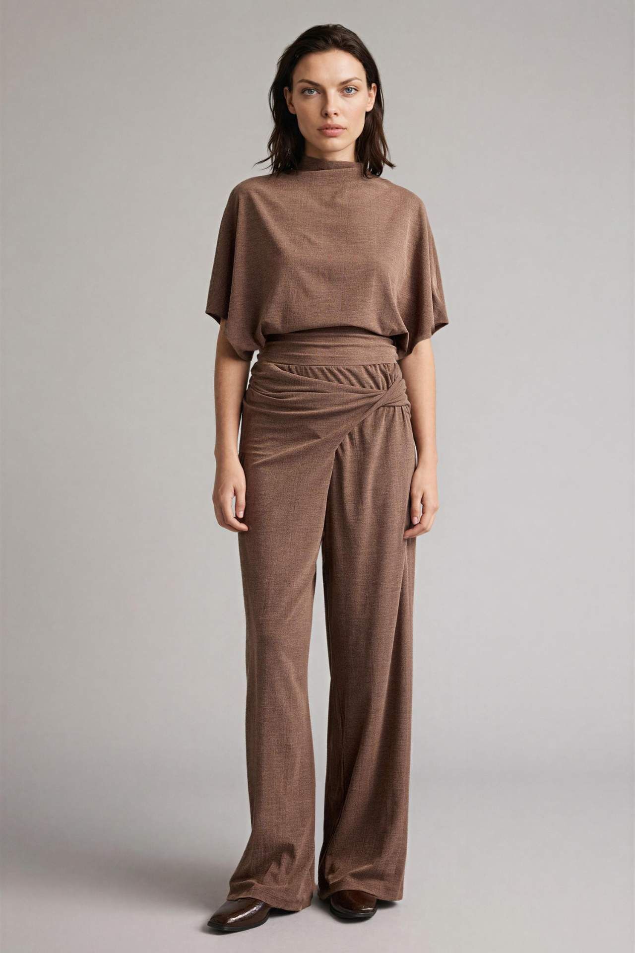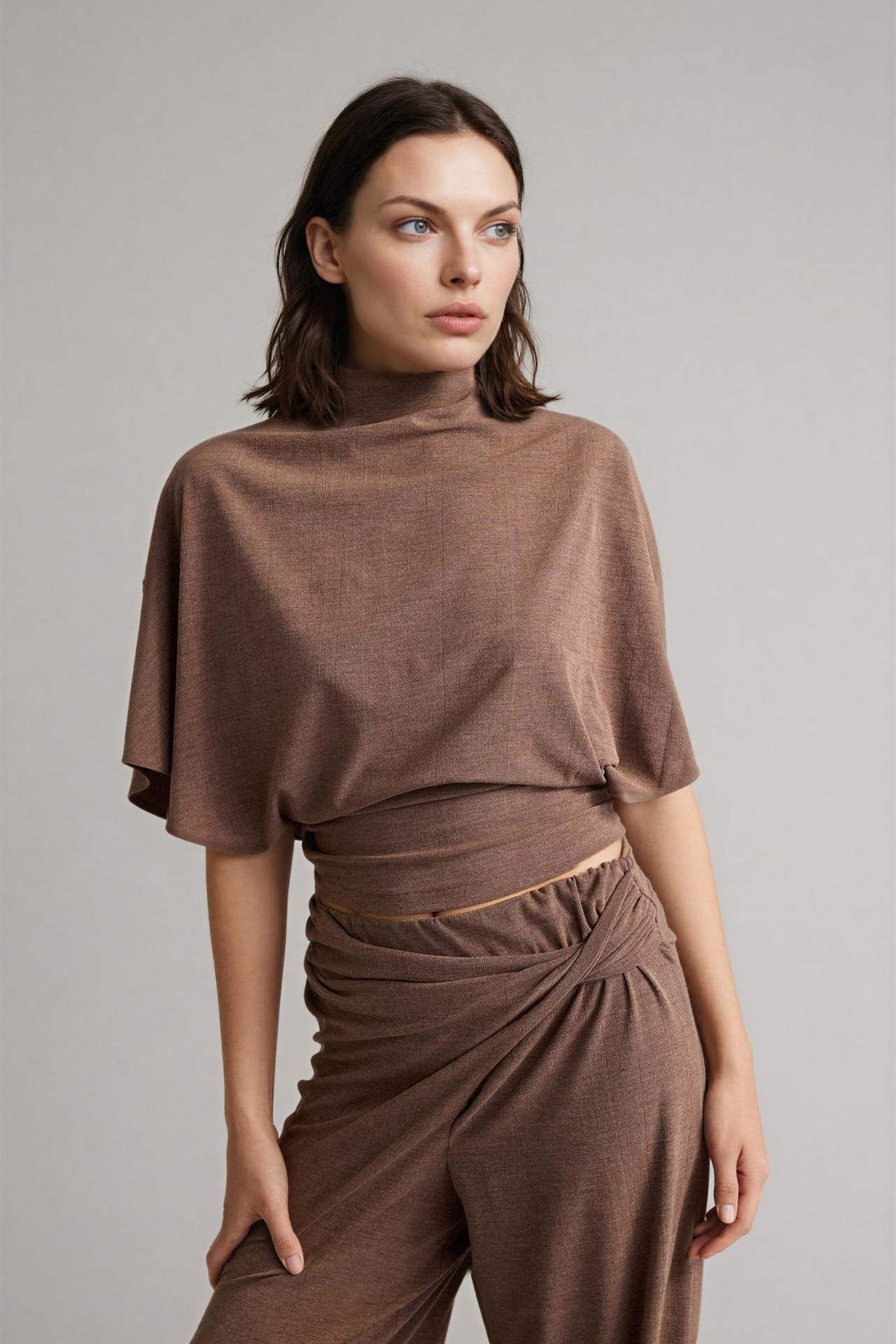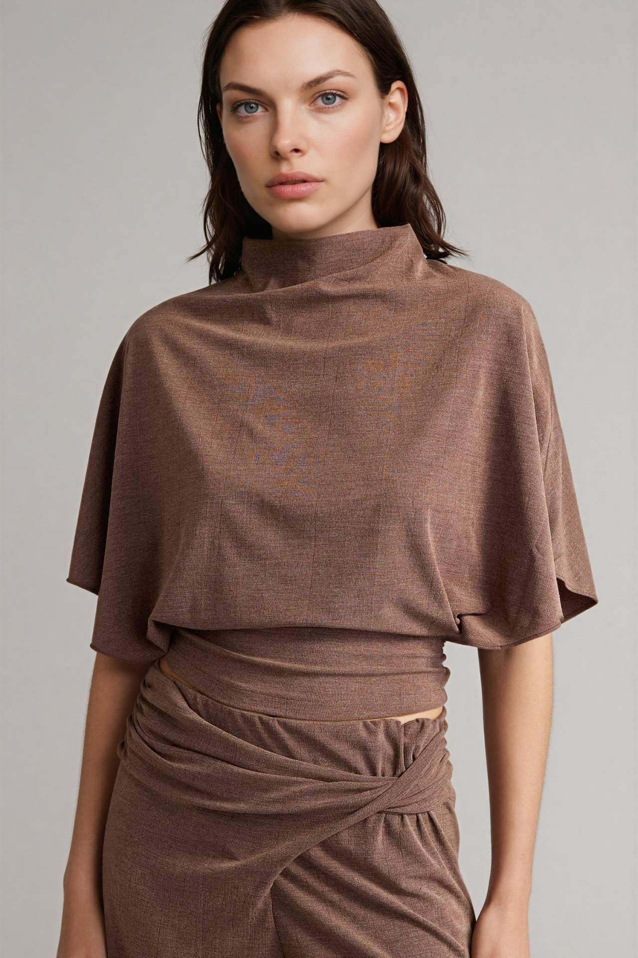 Kadınlar için ideal bir seçenek olan krep kumaştan yapılmış kısa kollu tişört. Slim fit kalıbı ve yarasa kol detayıyla şıklığı ve rahatlığı bir arada sunuyor. İlkbahar/yaz mevsimlerinde tercih edebileceğiniz kahverengi renk, temel bir parçadır. Yarım balıkçı yaka detayıyla tarzınızı tamamlayın. Elastan 4%,Viskoz 22%,Poliester 74%