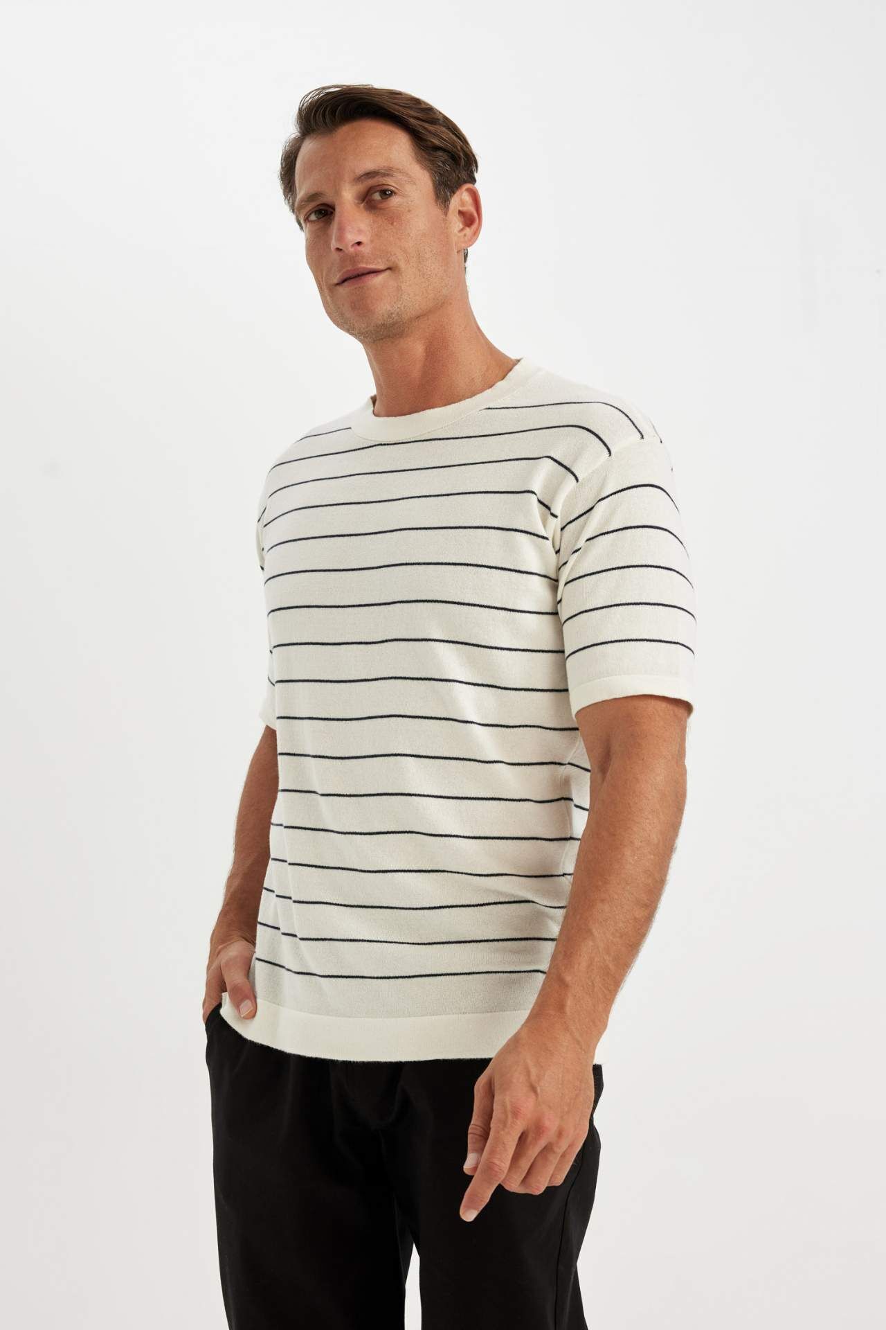 DeFactoFit Standart Fit Bisiklet Yaka Çizgili Pamuklu Kısa Kollu Tişört