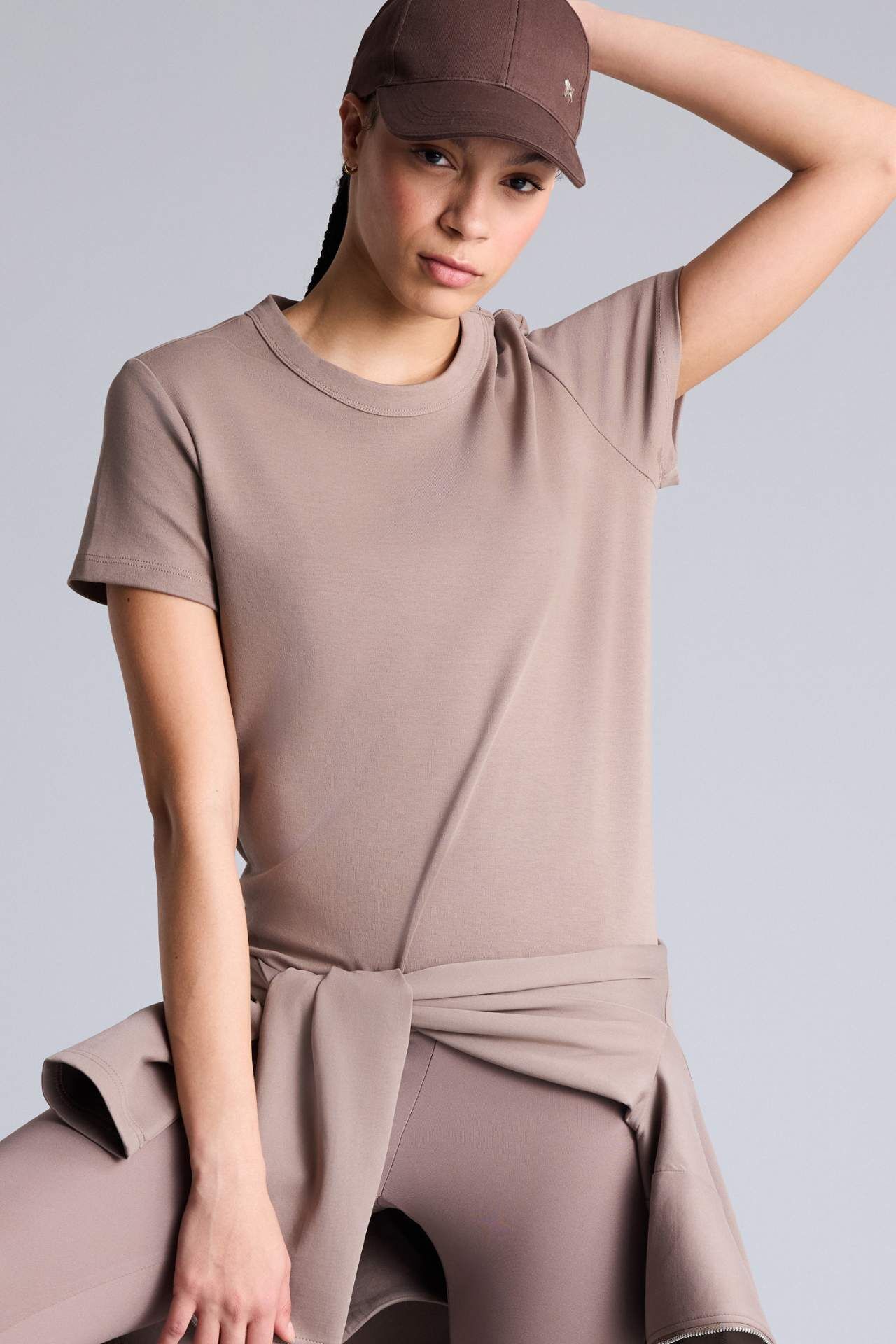 Pamuklu malzemeden üretilmiş kısa kollu tişört. Günlük giyim için idealdir. Kahve rengi ve standart fit kalıbıyla öne çıkar. Bisiklet yaka detayı ve ribanalı yakasıyla dikkat çeker. İlkbahar/Yaz sezonunda kullanım için uygundur. Sporcu tarzını yansıtır ve kadınlar için tasarlanmıştır. Pamuk 100% Manken Bedeni: Göğüs: 82 Boy: 1,78 Basen: 88 Bel: 60
