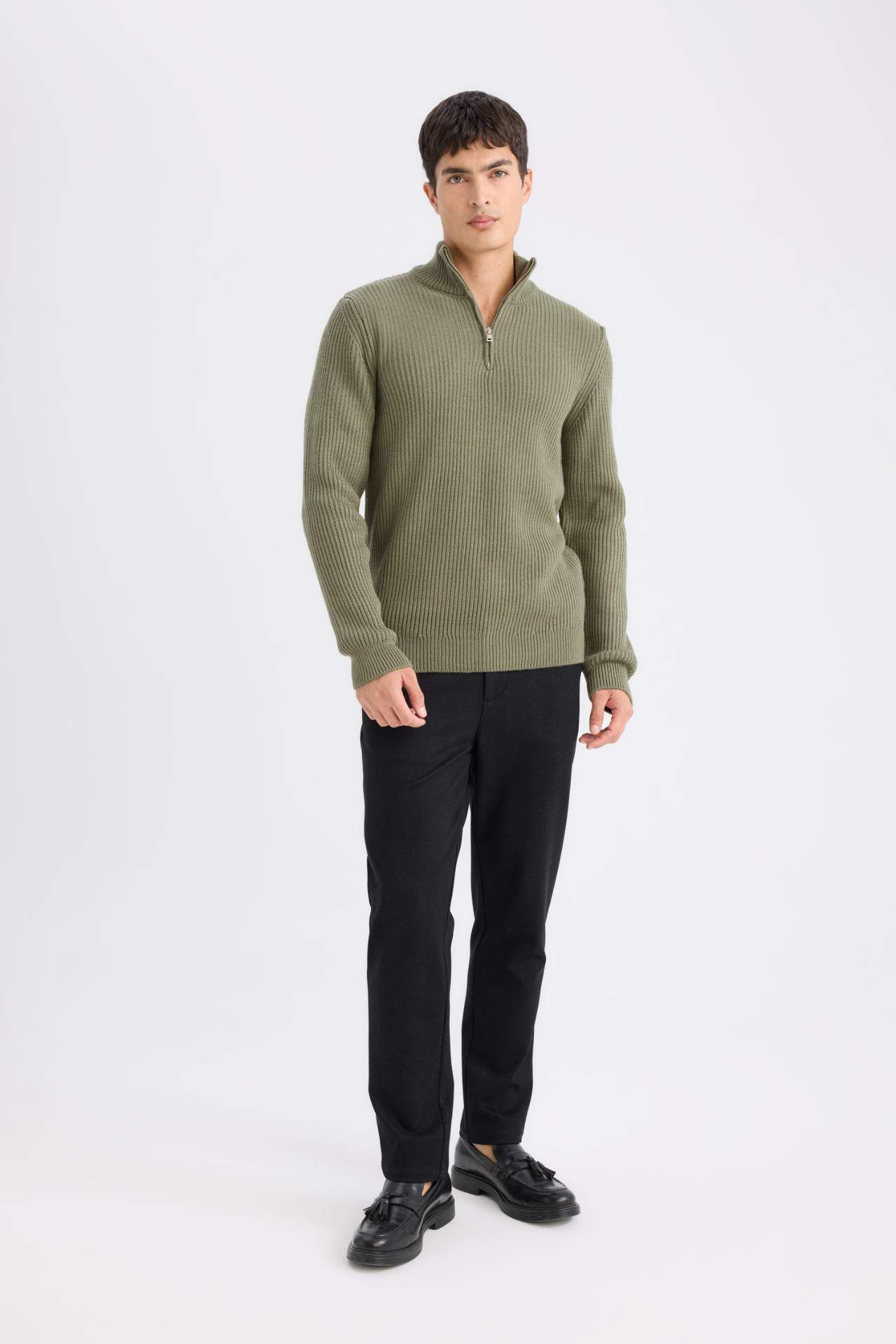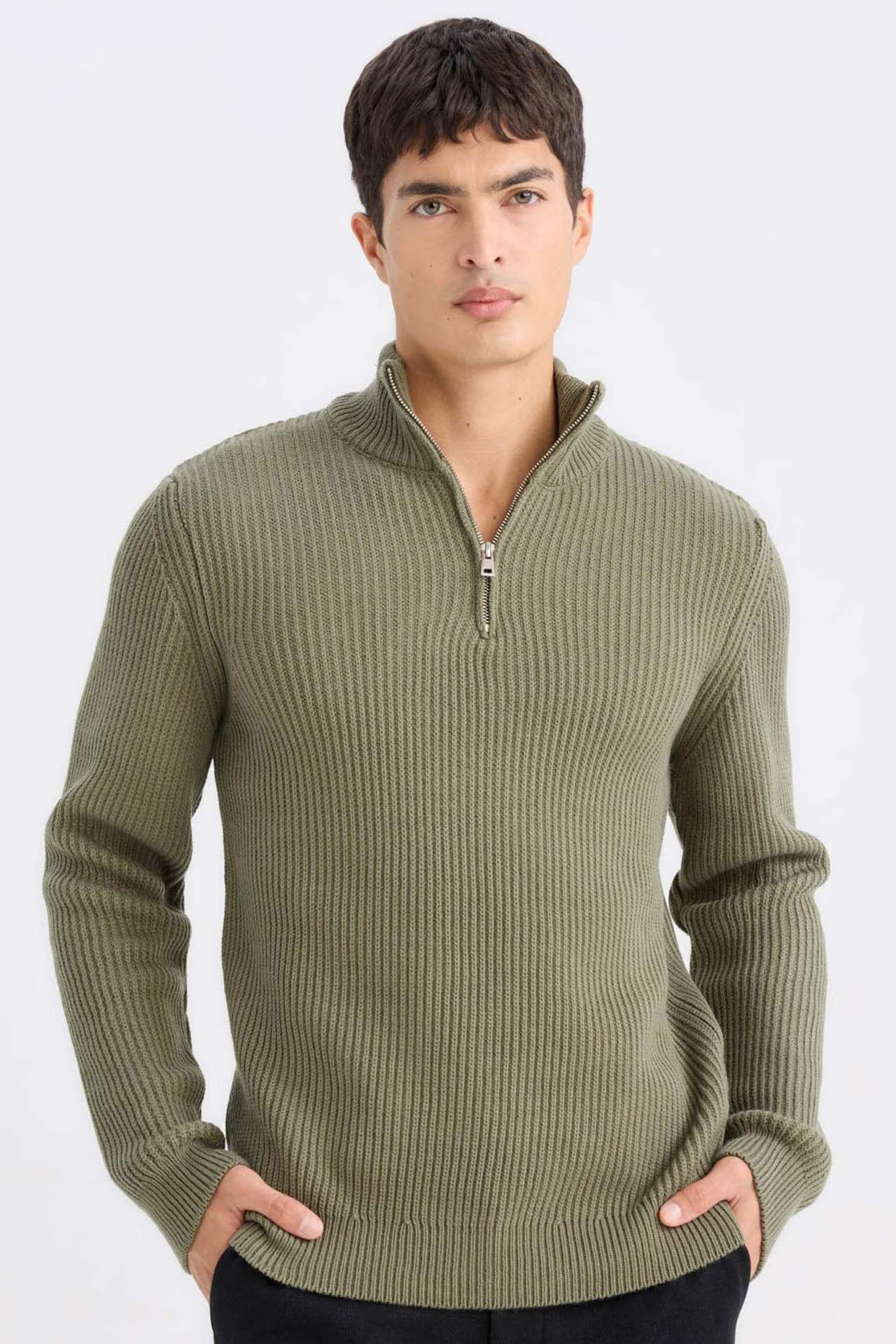 DeFacto Standart Fit Normal Kesim Bato Yaka Fermuarlı Basic Düz Triko Kazak