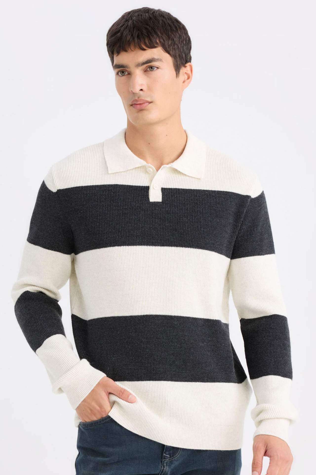 DeFacto Standart Fit Polo Yaka Çizgili Triko Kazak D3590AX24WNER139