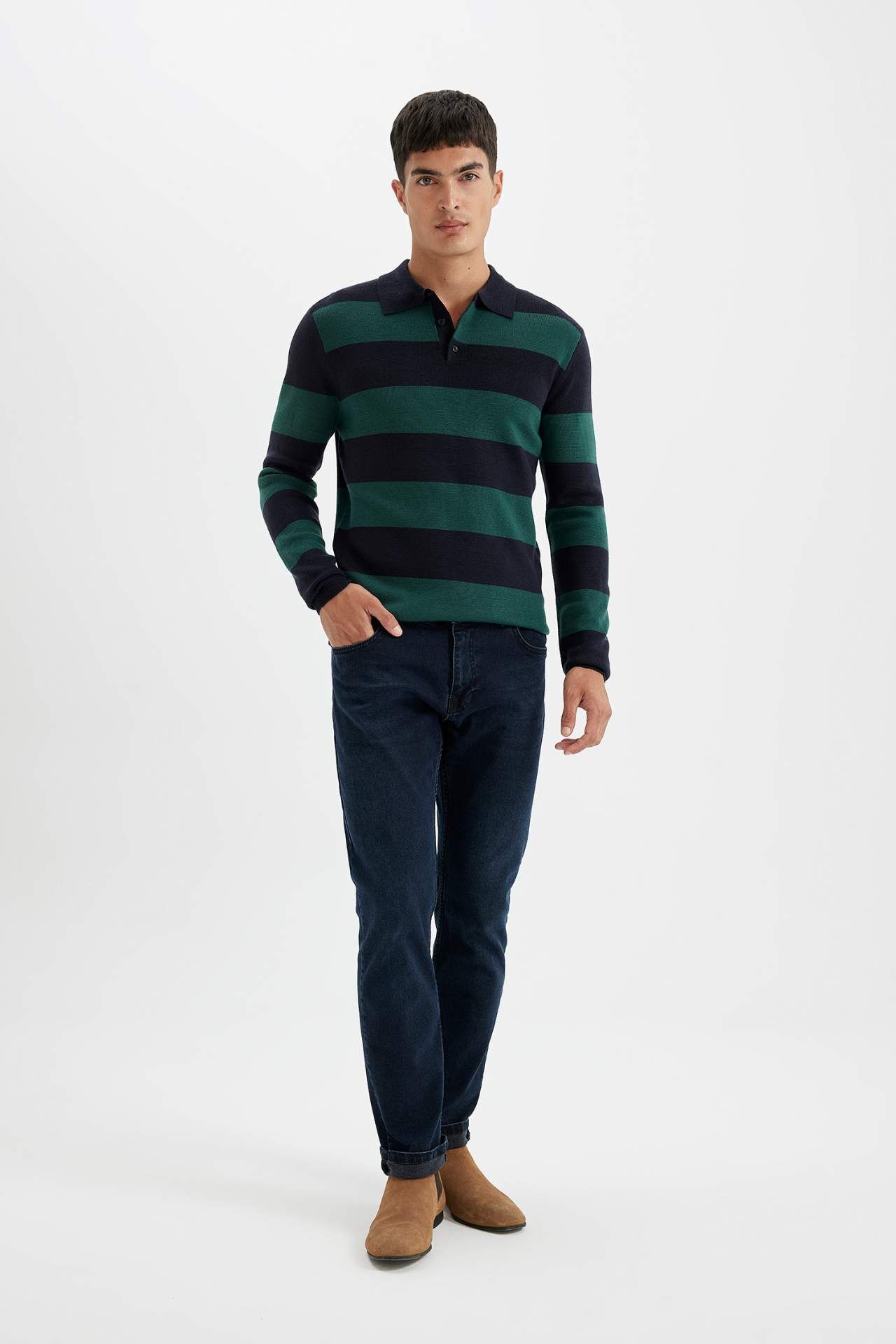 DeFacto Standart Fit Polo Yaka Çizgili Triko Kazak Y4194AZ24WNGN852