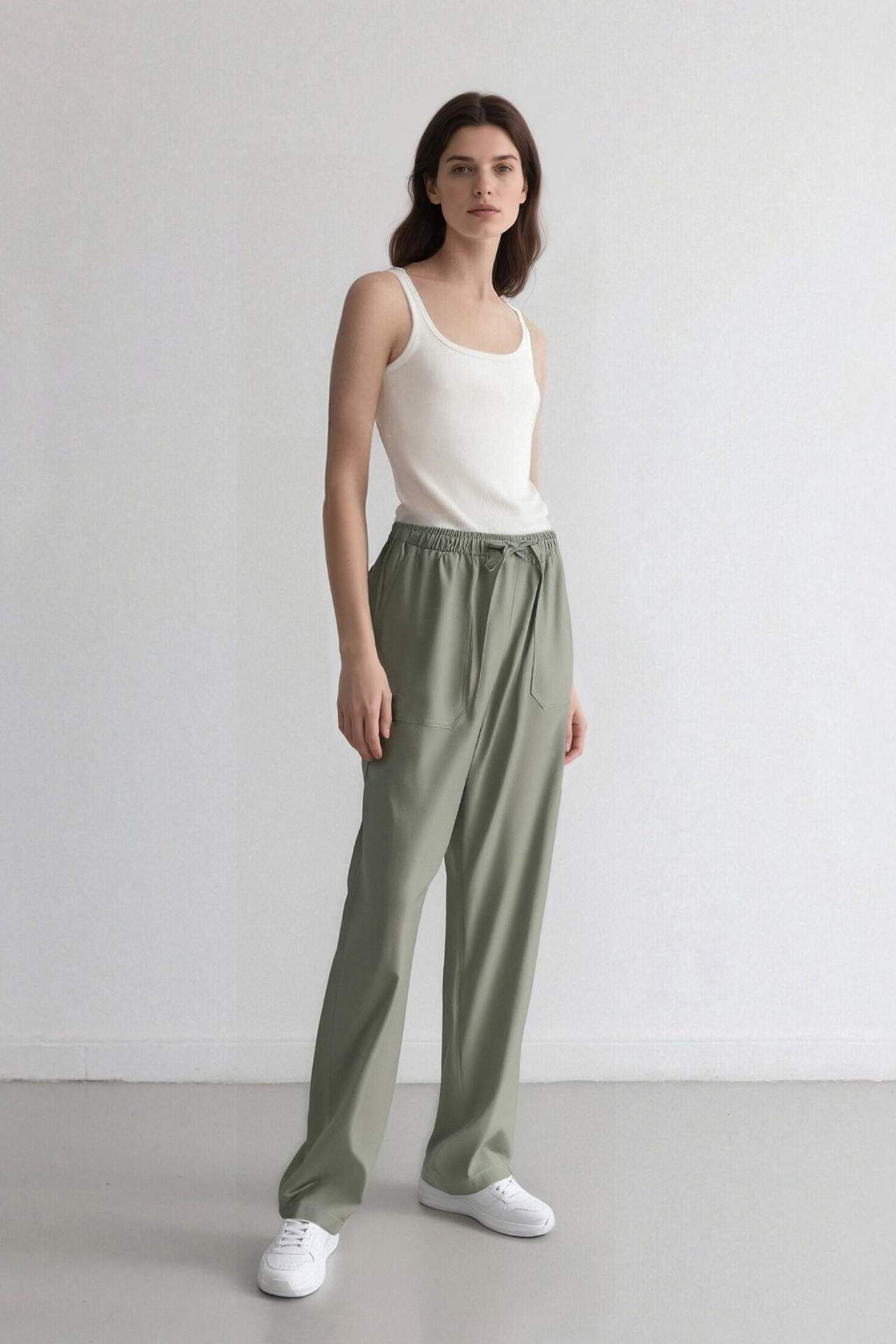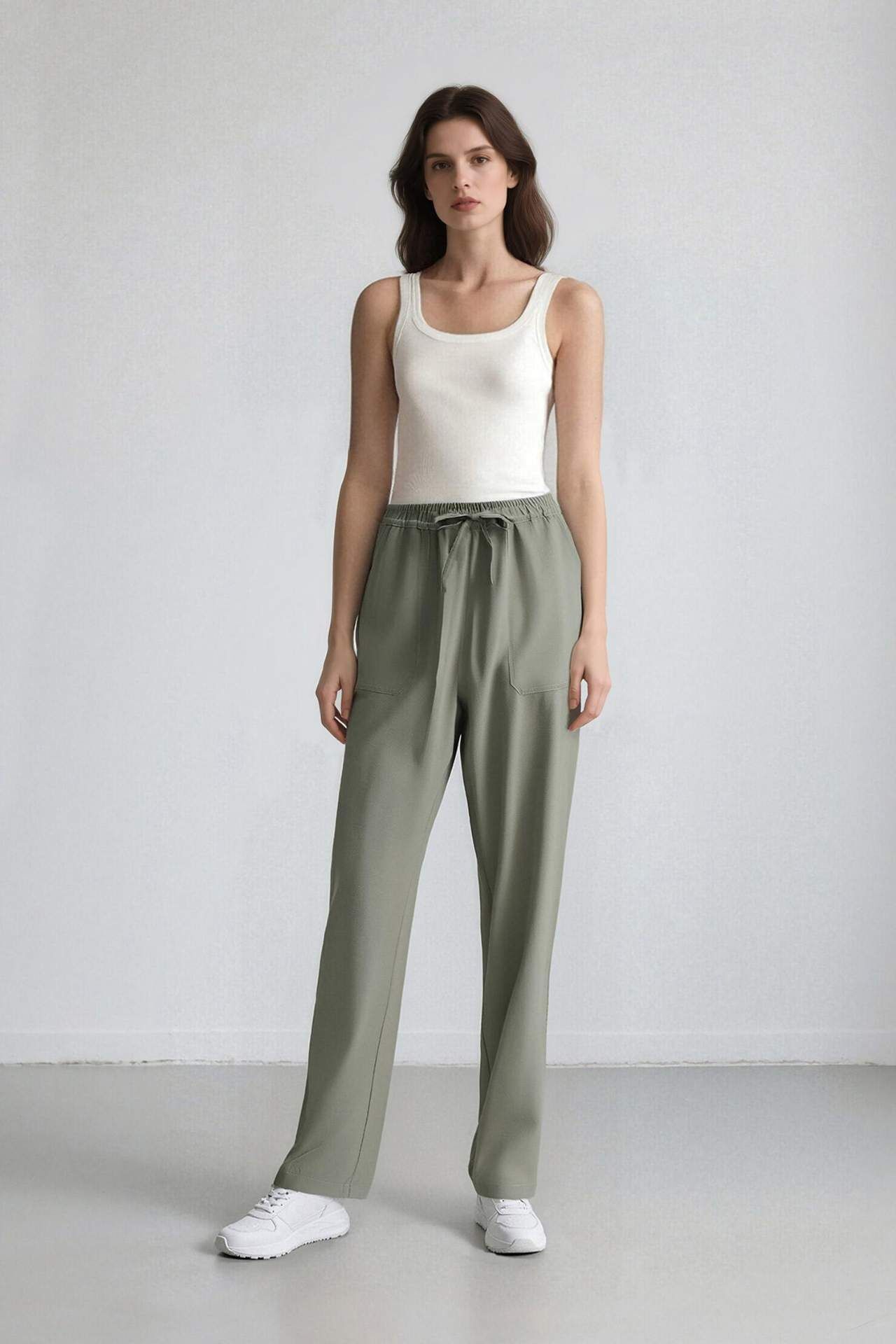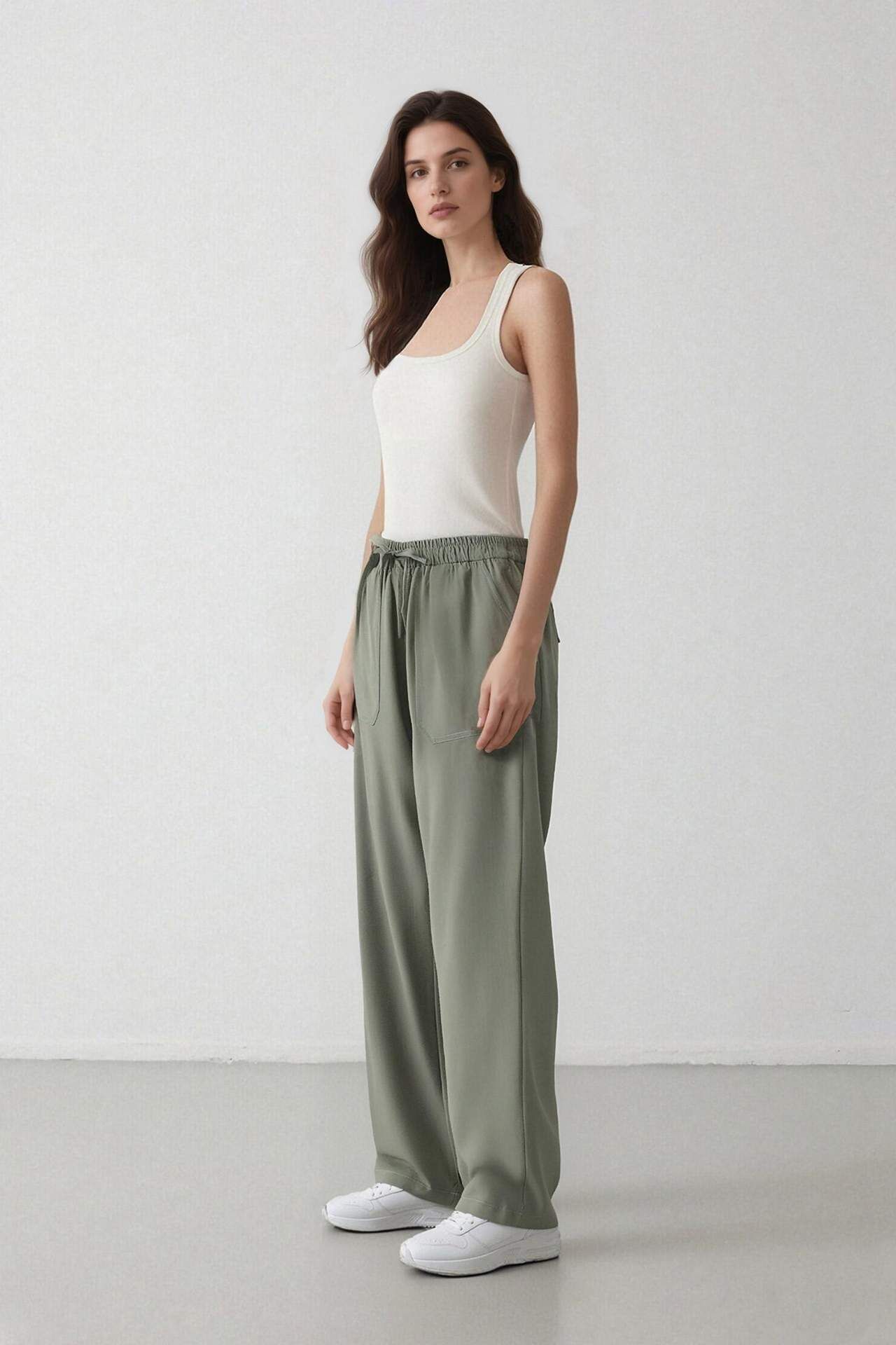 Yüksek bel, çift cepli kadın pantolon. Modal kumaştan üretilmiş, düz paça ve lastikli kapama detayına sahip straight fit pantolon. İlkbahar/Yaz için ideal temel bir parça. Yeşil tonuyla dikkat çekici bir seçenek. Modal 82%,Poliester 18%,Modal 82%,Poliester 18%,Modal 82%,Poliester 18%,Modal 82%,Poliester 18% Manken Bedeni: Göğüs: 0 Boy: 1,75 Basen: 0 Bel: 0