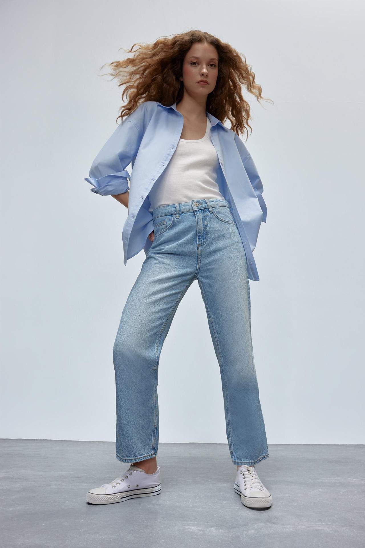 Bu sürdürülebilir mavi jean pantolon, yüksek bel ve straight fit kalıbıyla vücudu saran bir şekilde tasarlandı. Bilek boy kesimi ve yıkamalı detaylarıyla ilkbahar/yaz sezonu için ideal bir seçimdir. Yetişkin kadınlar için temel kot çeşitlerinin vazgeçilmezi. Pamuk 100%,Pamuk 100%,Pamuk 100%,Pamuk 100%,Pamuk 100%,Pamuk 100%