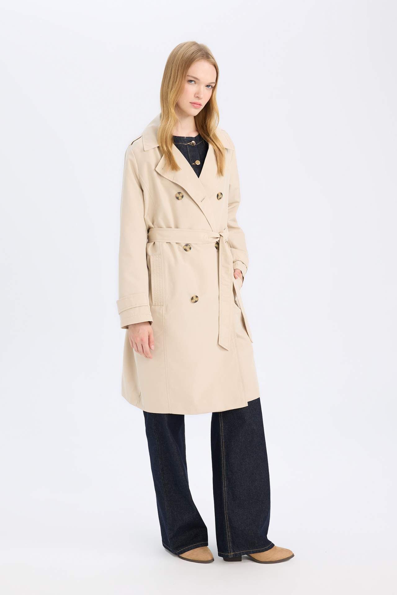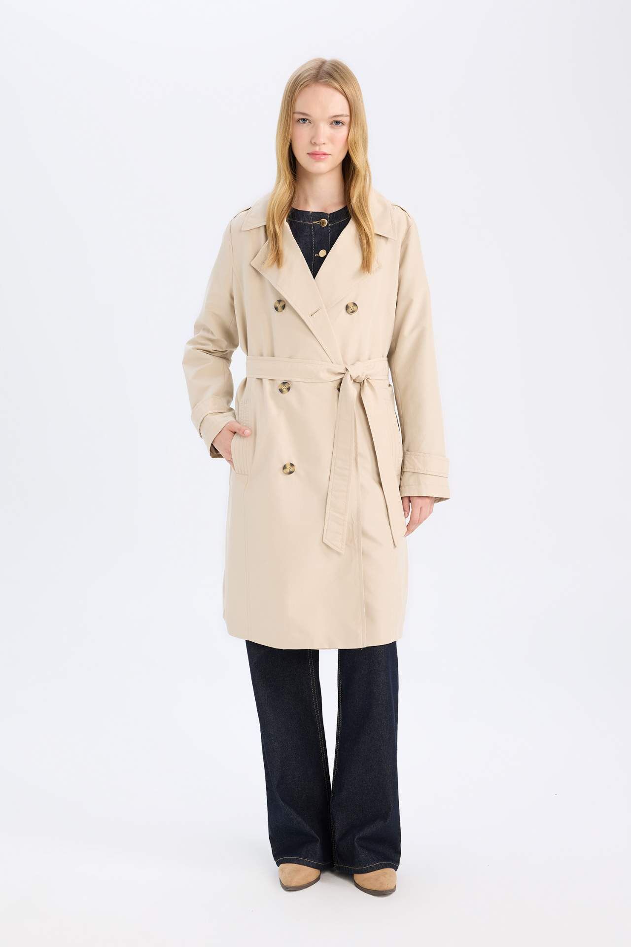 Su geçirmez yapısıyla öne çıkan mevsimlik trençkot, kruvaze yaka, düğmeli ve kemerli tasarımıyla klasik şıklığı modern bir çizgiyle buluşturur. Cepli ve apoletli detaylarıyla hem fonksiyonel hem stil sahibi bir görünüm sunar. Geçiş mevsimlerinde zarif ve kullanışlı bir dış giyim alternatifidir. Poliester 100%,Poliester 100%,Poliester 100%
