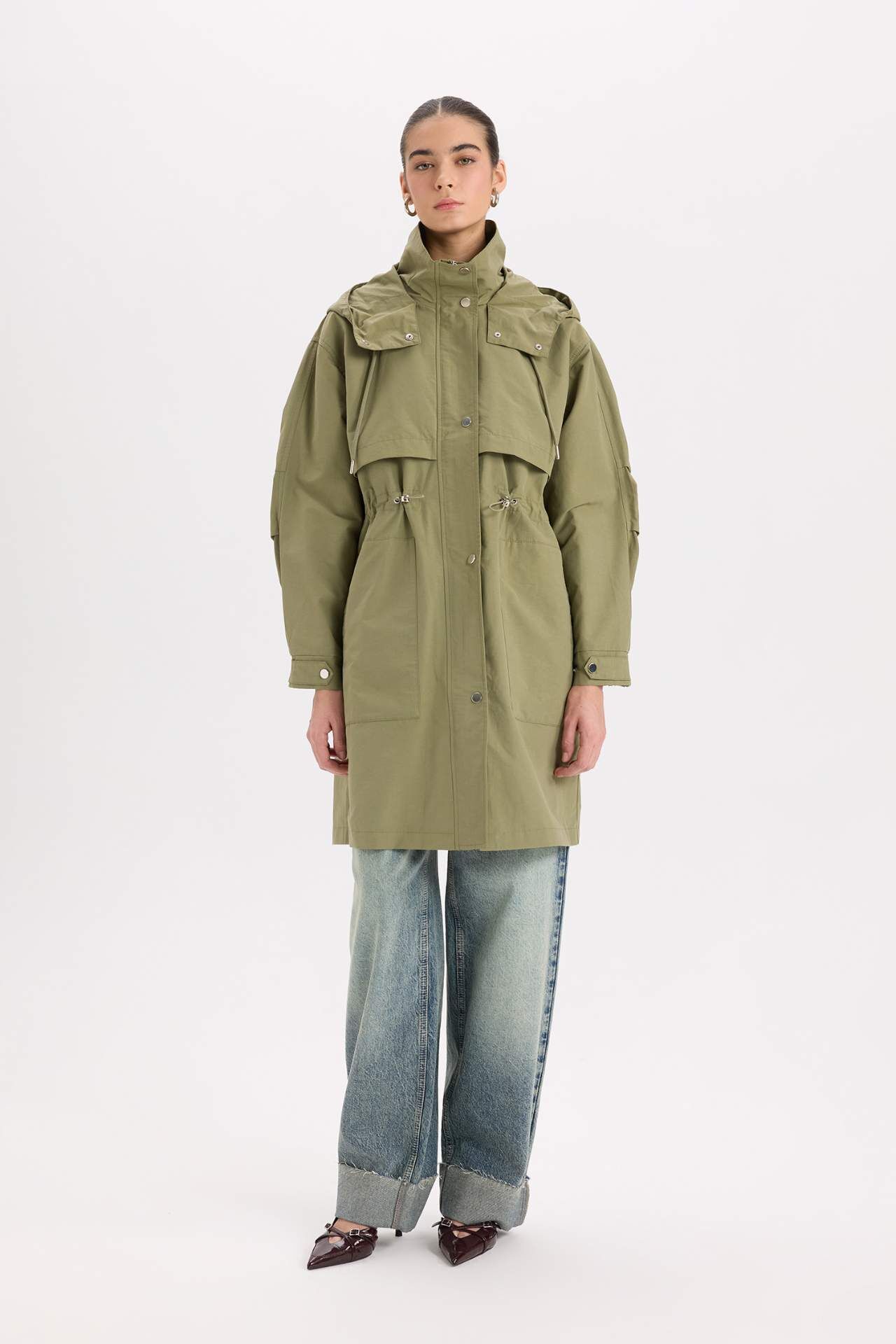 DeFacto Su İtici İnce Uzun Mont Parka Oversize Geniş Kesim Kapüşonlu Cepli