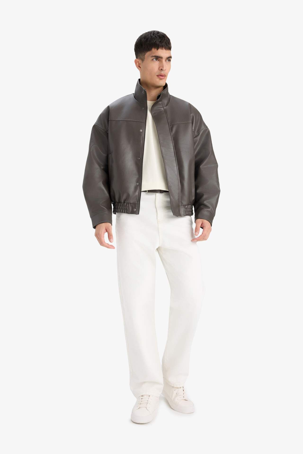 Su İtici Oversize Geniş Kalıp Dik Yaka Suni Deri Mont