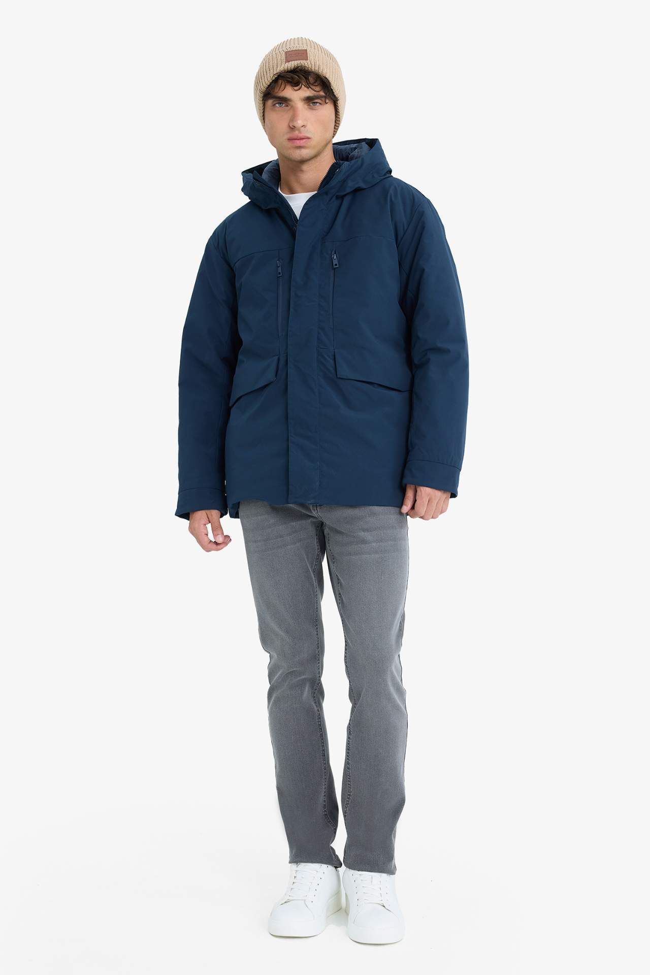 Su İtici Regular Fit Kapüşonlu Fermuarlı İç Cepli Cebi Pelüşlü Mont