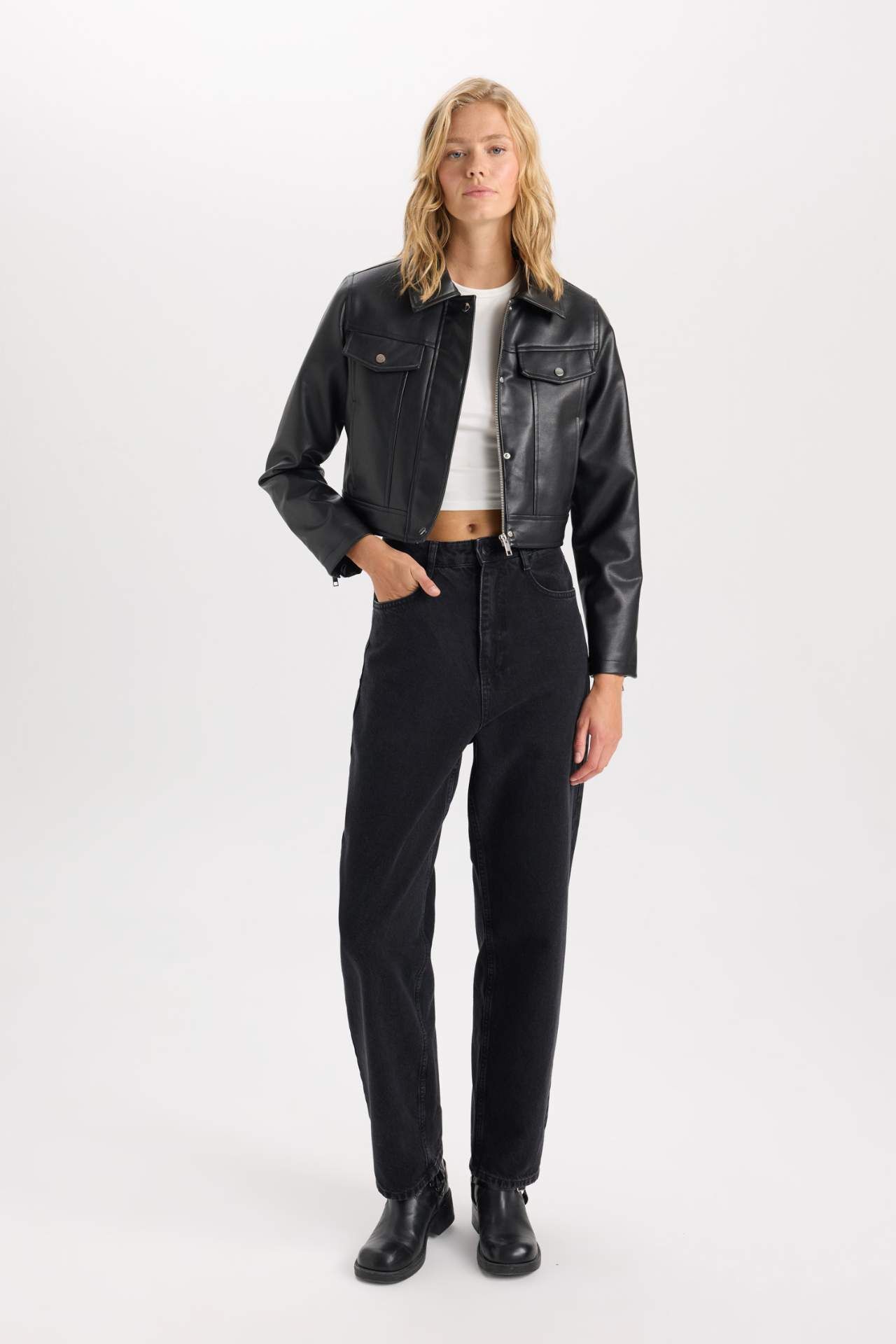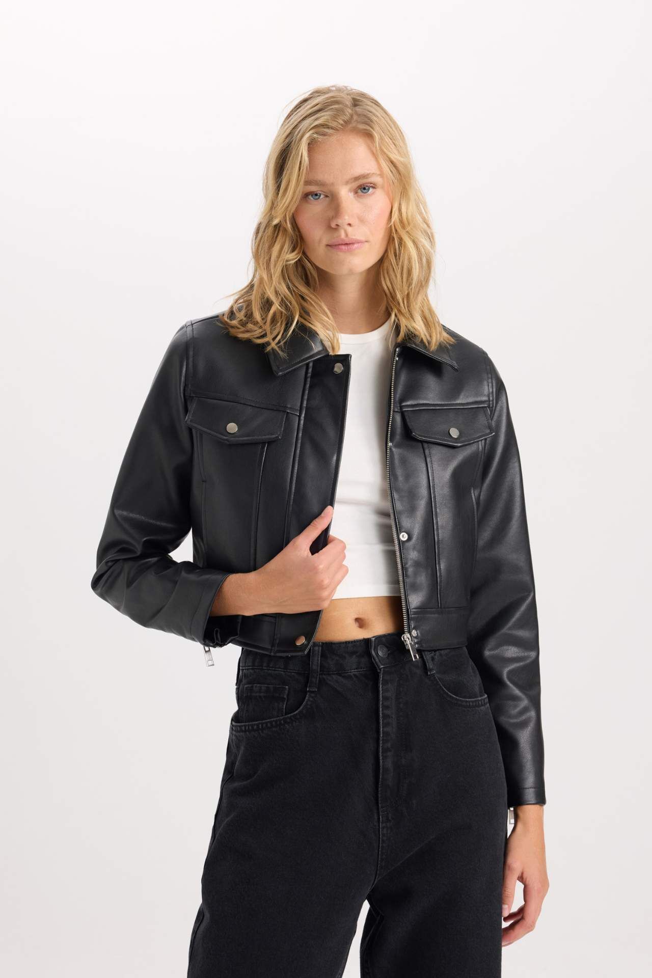 DeFacto Su İtici Suni Deri Mont Polo Yaka Cepli Fermuarlı Çıtçıtlı