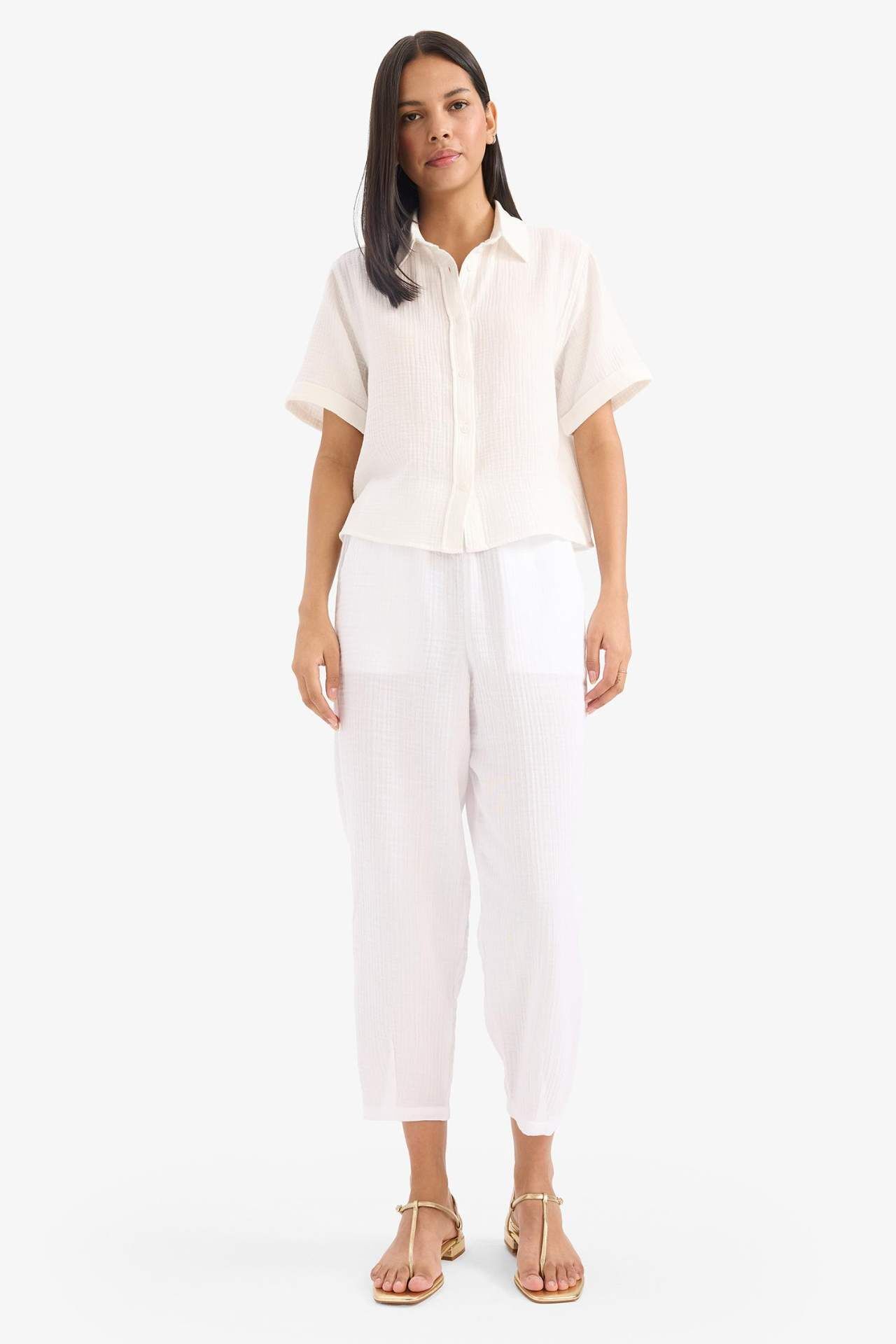 Yetişkin kadınlar için tasarlanmış yüksek bel beyaz müslin dokuma pantolon. Tapered Fit kalıbı ve lastikli kapama detayı ile rahat ve şık bir görünüm sunar. Uzun boylu ve yaz mevsimi koşullarına uygun olan bu temel çeşit pantolonun stilinizi tamamlayacak. Pamuk 100%,Pamuk 100%,Pamuk 100%,Pamuk 100%,Pamuk 100% Manken Bedeni: Göğüs: 78 Boy: 1,77 Basen: 89 Bel: 59