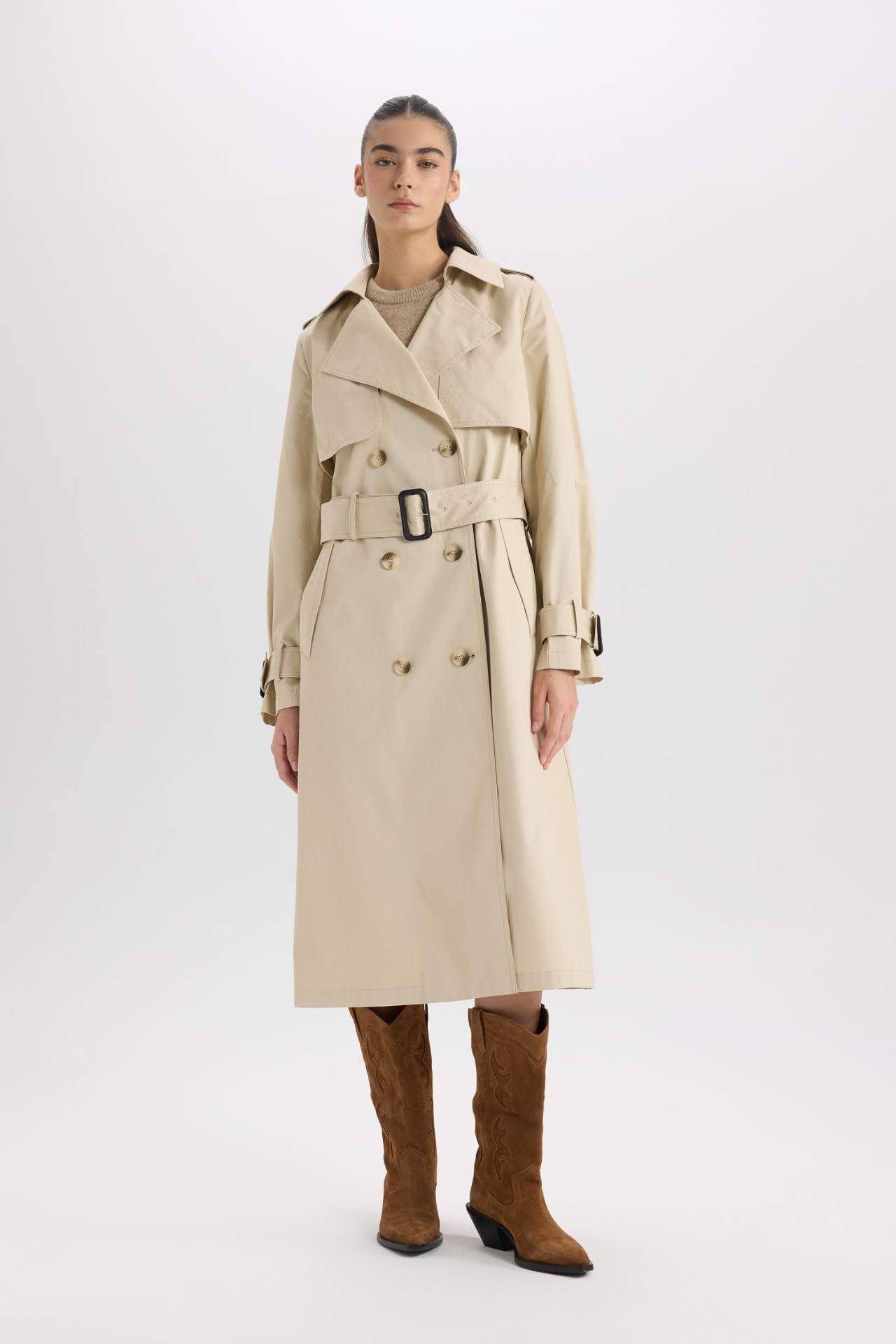 DeFacto Uzun Trençkot Kruvaze Yaka Düğmeli Cepli Kemerli Apoletli