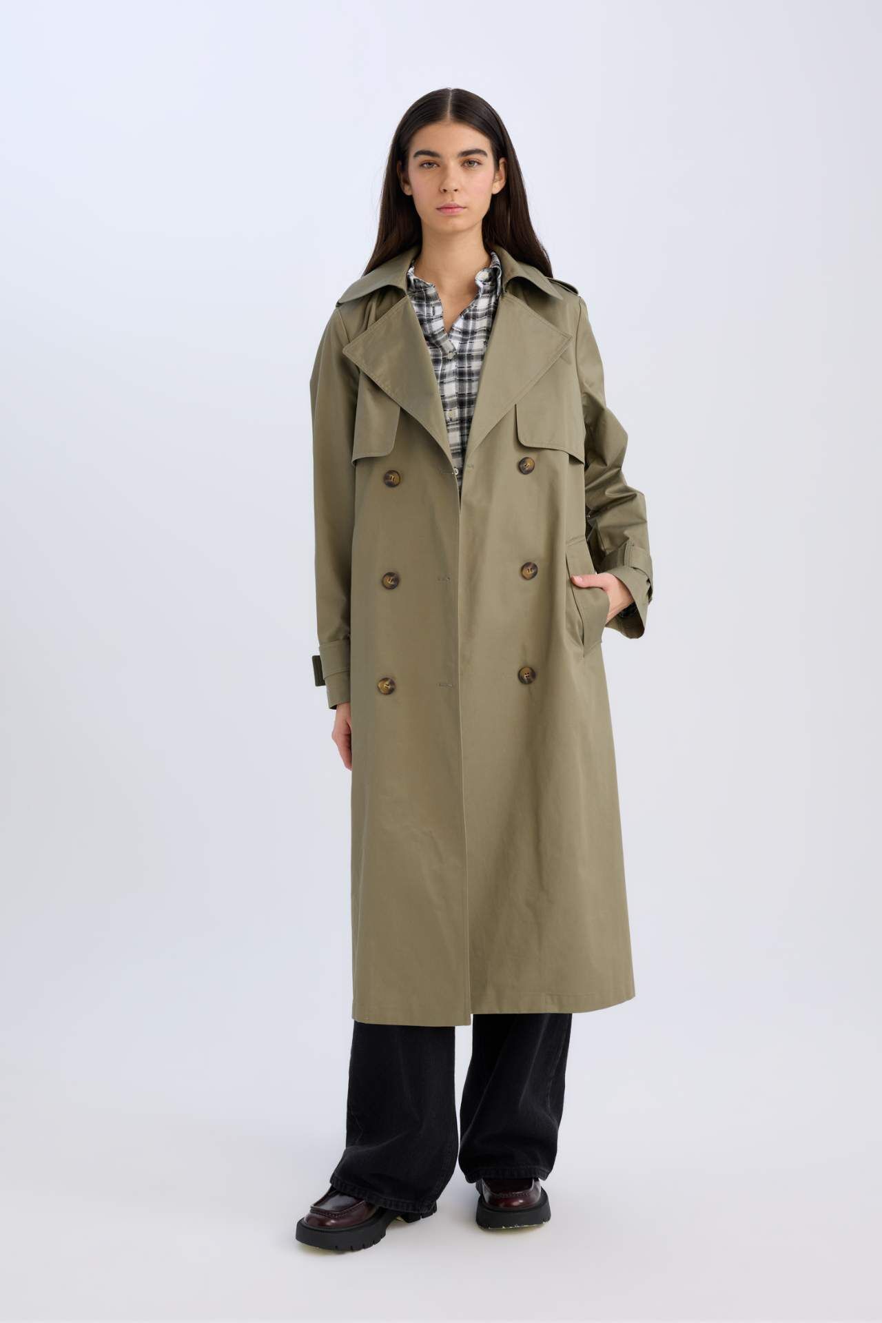 DeFacto Uzun Trençkot Kruvaze Yaka Düğmeli Cepli Kemerli Apoletli