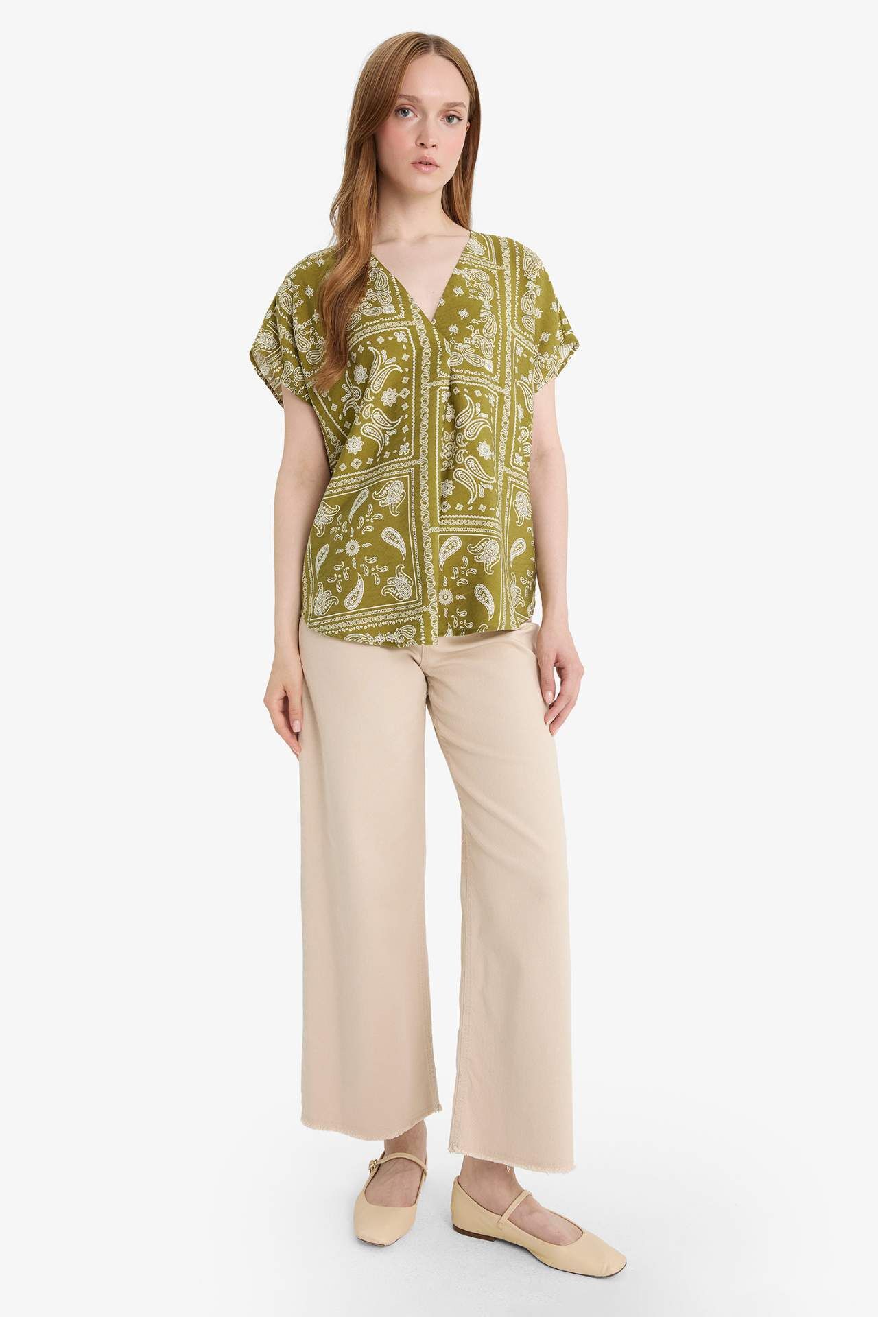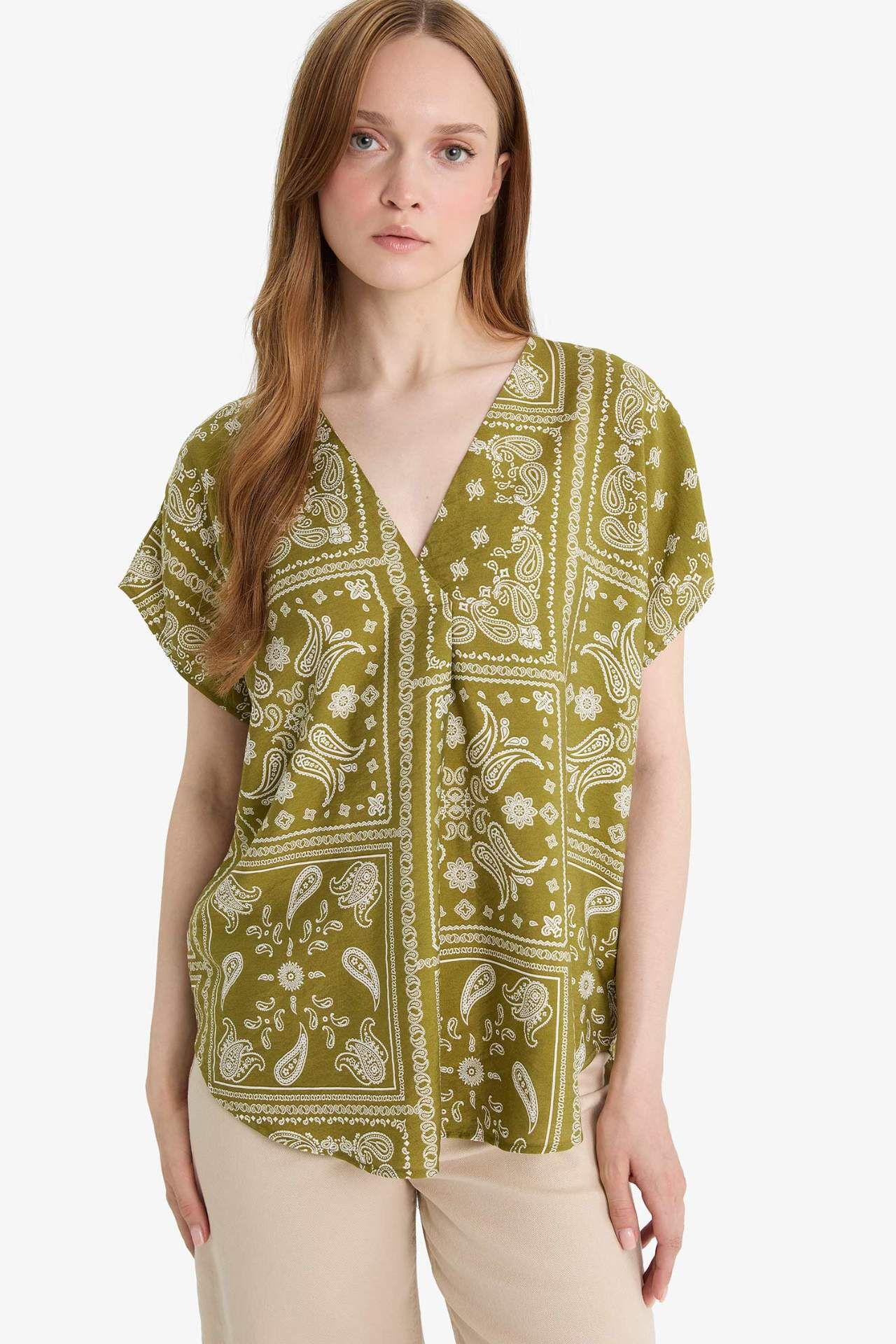V Yaka Desenli Kısa Kollu Bluz