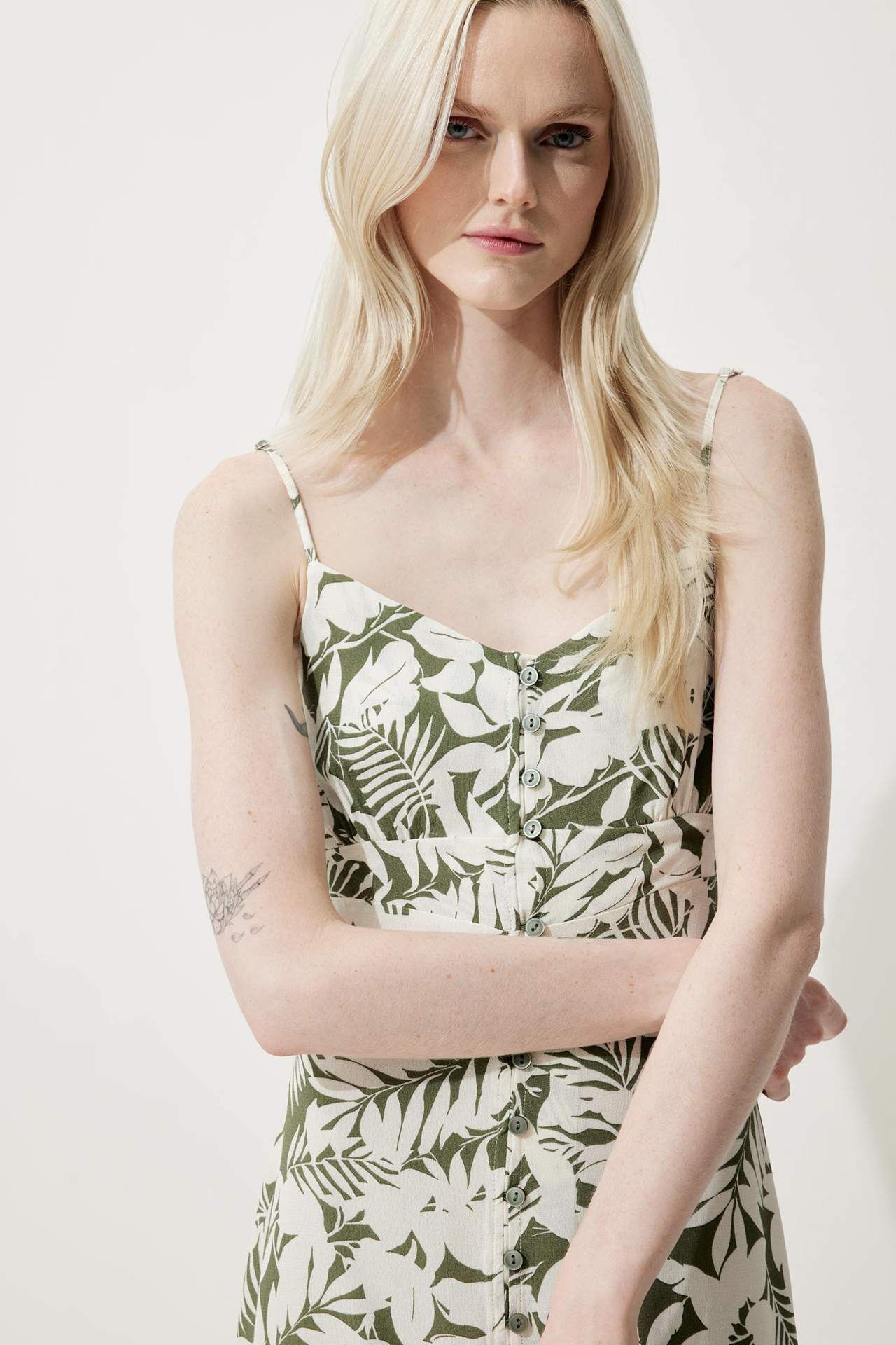 V yaka çiçek desenli maroken askılı midi elbise, hafif ve dökümlü kumaşıyla yaz aylarında ferah bir kullanım sunar. Zarif deseni ve rahat kesimiyle günlük şıklığı tamamlar. Viskoz 100%,Viskoz 100%,Viskoz 100%,Viskoz 100%,Viskoz 100%,Viskoz 100%,Viskoz 100% Manken Bedeni: Göğüs: 78 Boy: 1,78 Basen: 89 Bel: 61