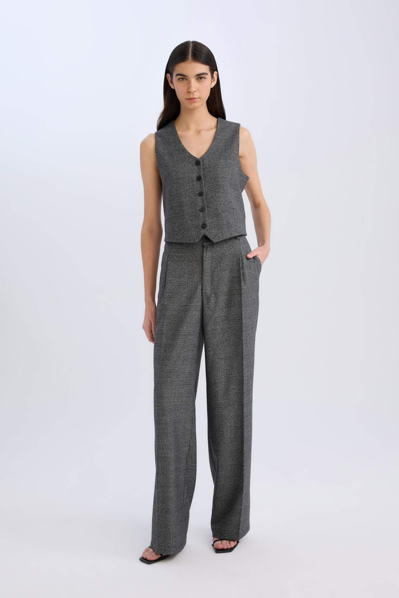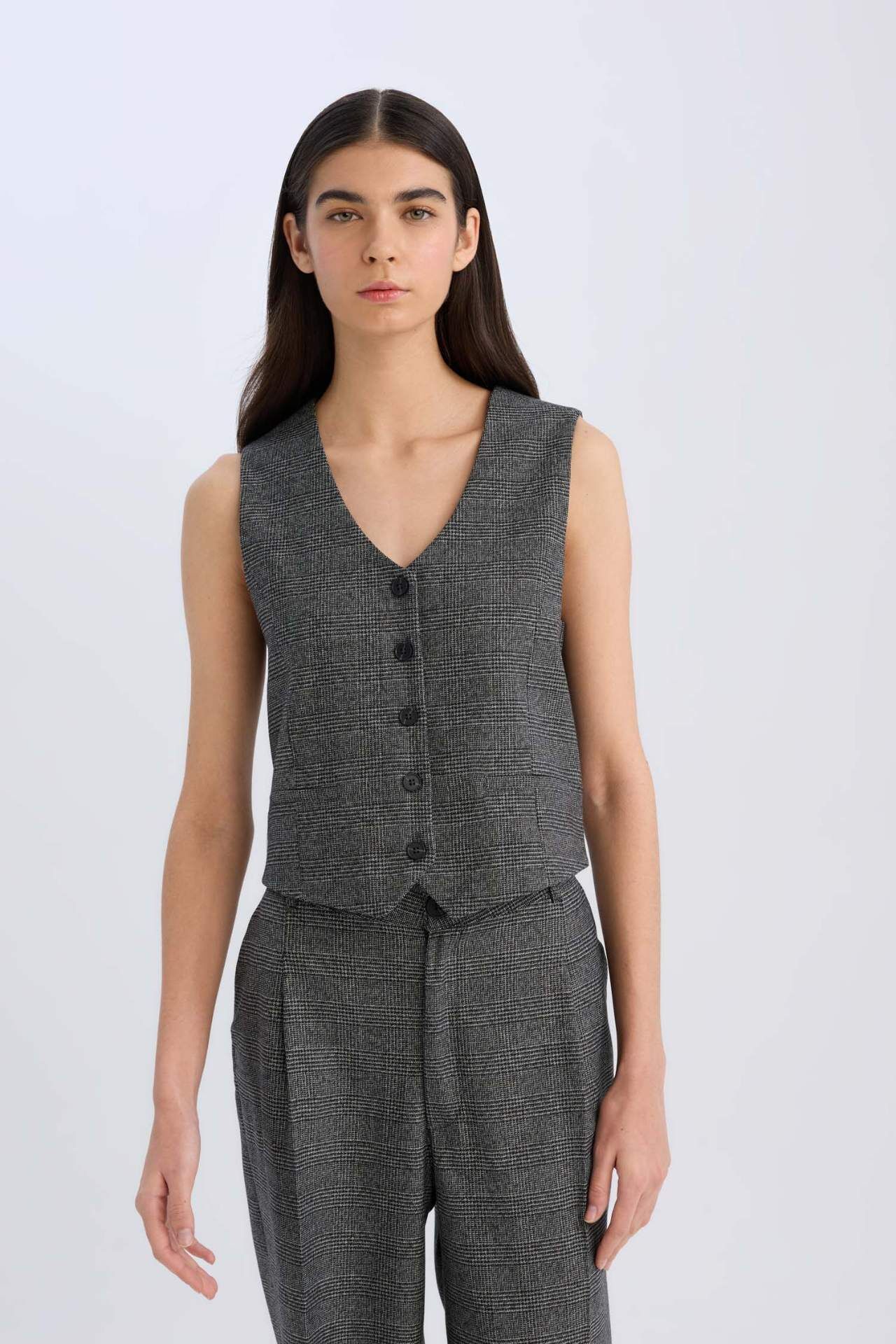 V Yaka Kareli Düğme Kapamalı Blazer Yelek