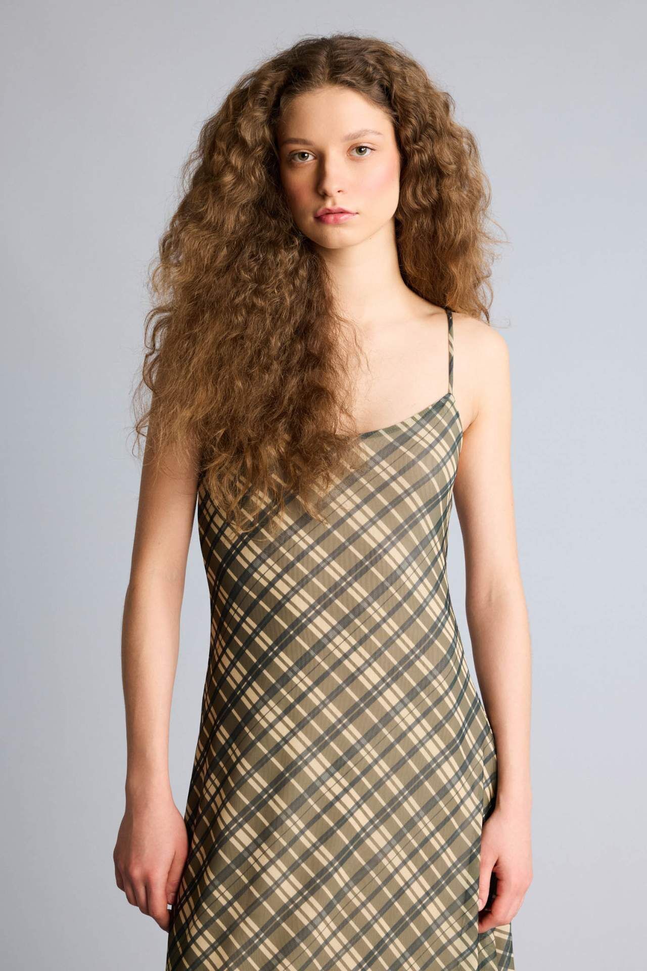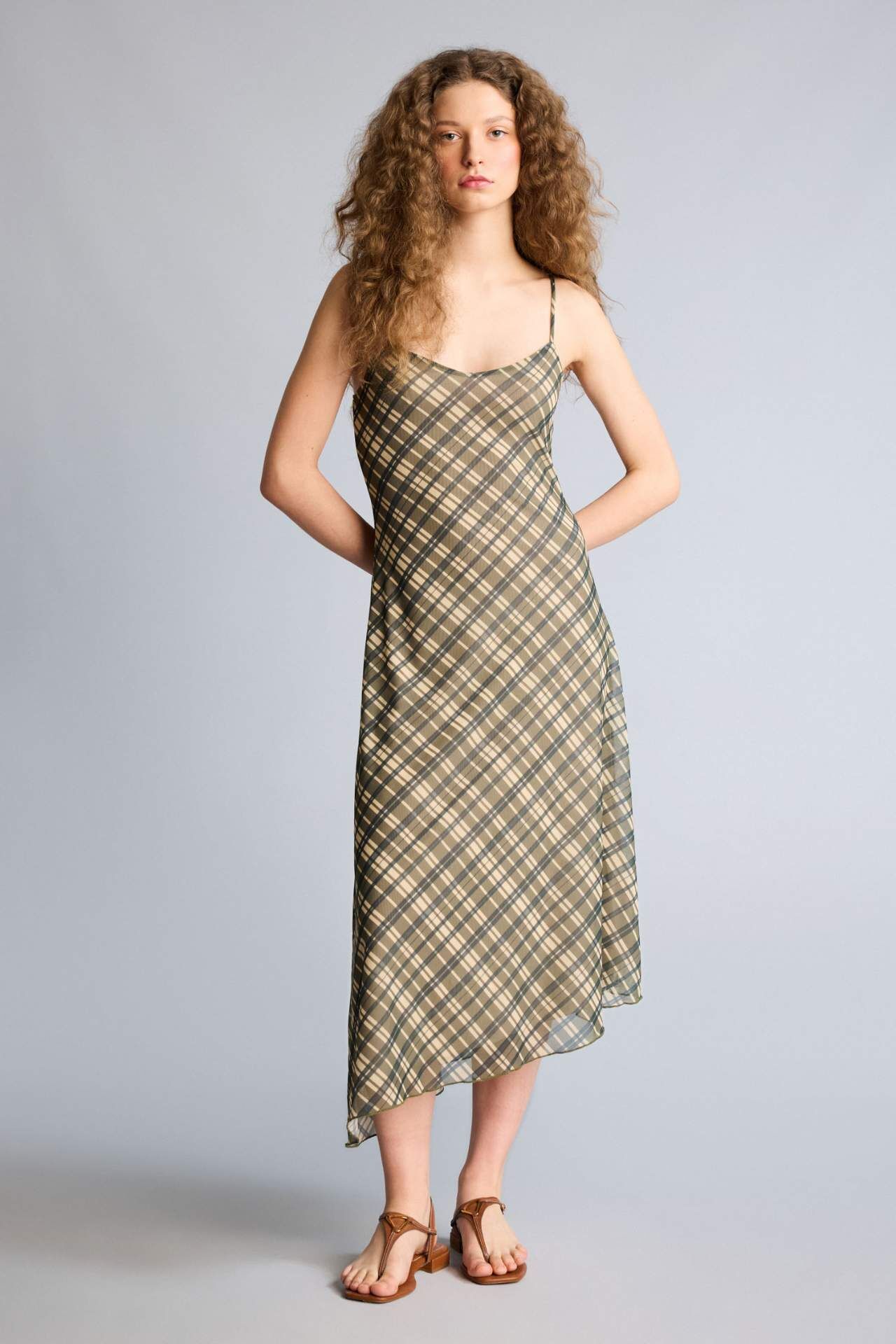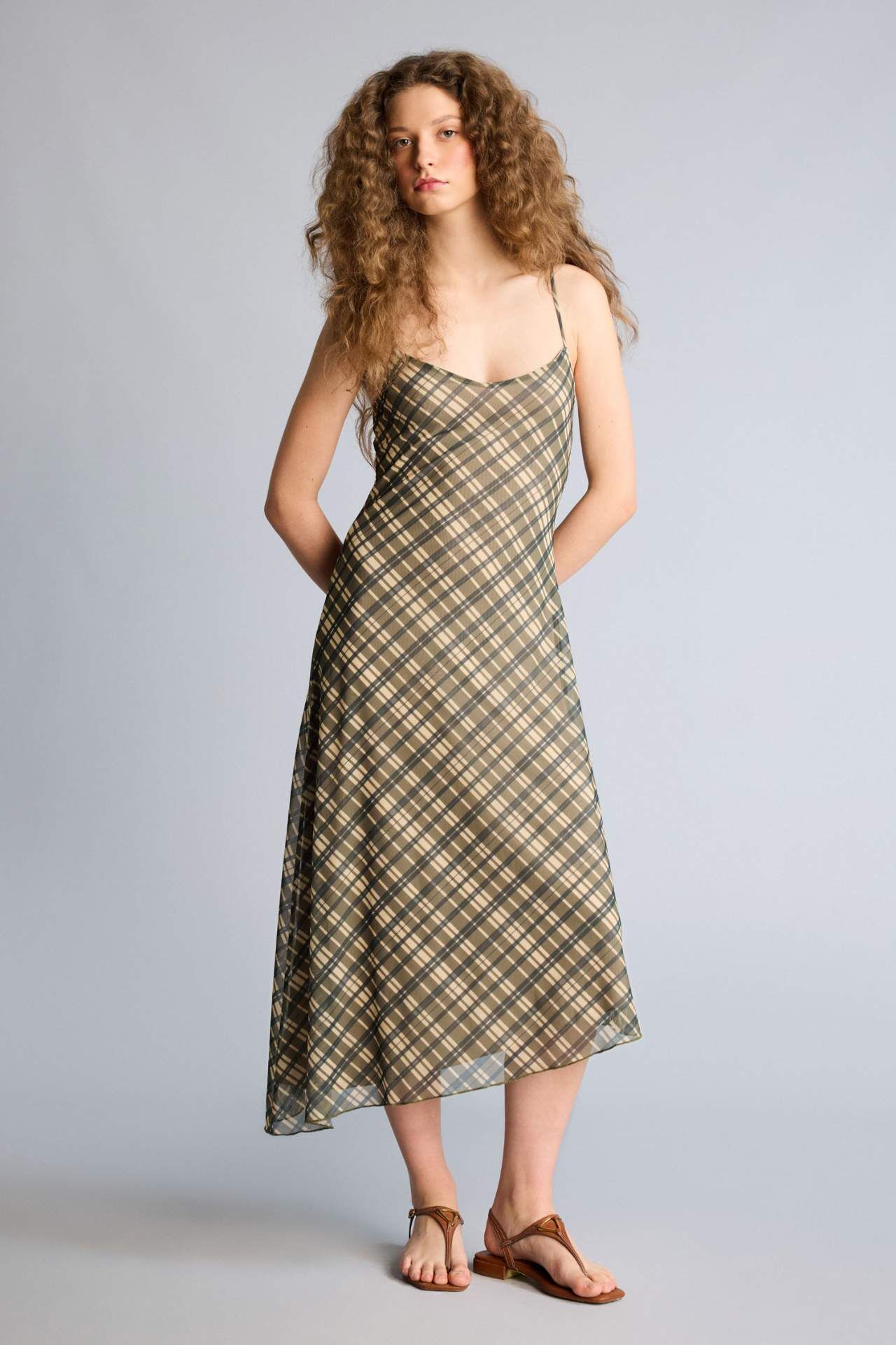 DeFacto V Yaka Kareli Tül Askılı Midi Elbise