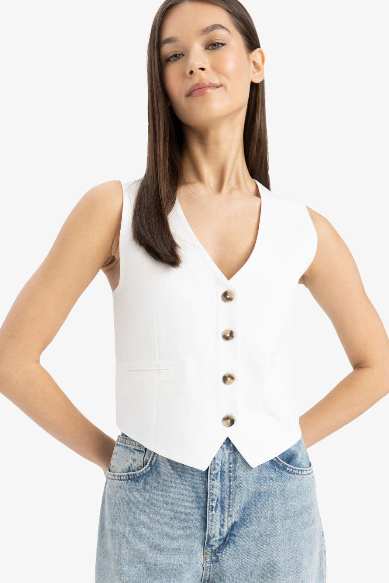 V Yaka Keten Karışımlı Beyaz Blazer Yelek E9757AX25SPWT32